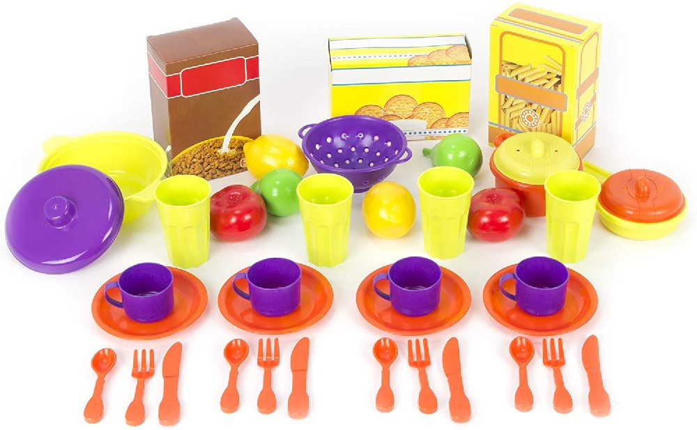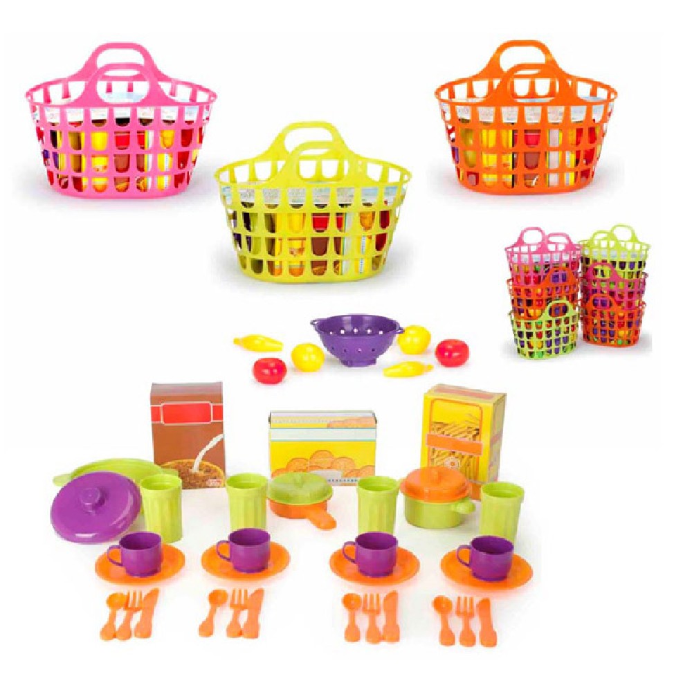 Colorida cesta de la compra fabricada en plástico para ayudar a mamá en el mercado. ¿Ya has hecho la lista de la compra? Coge tu cesta y vamos comprar. Tienes un completo set de vajilla para preparar deliciosas meriendas. Tazas, platitos, cubiertos… Guárdalo todo en esta preciosa y ligera cesta de plástico.