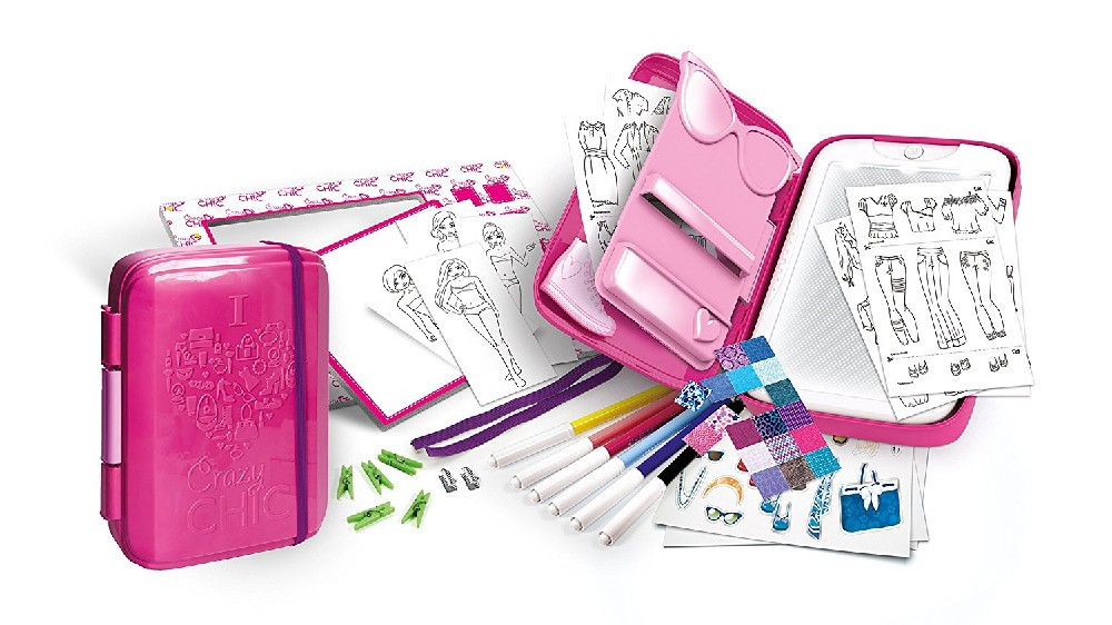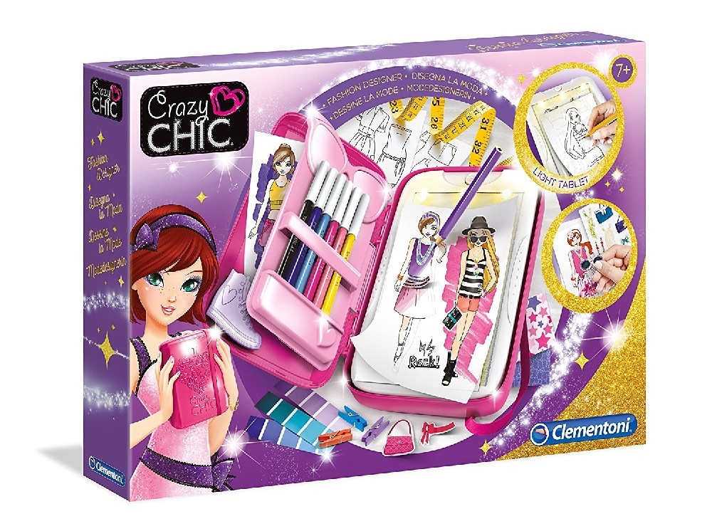 Incluye: 1 book de plástico y portarrotuladores con clips para montar, tableta luminosa, goma, terminales metálicos, fichas con perfiles de las 4 Crazy Chic para calcar, fichas con vestidos para calcar, complementos de pegatina pega y despega, rotuladores de colores, marco de cartón para personalizar, pinzas de colores y manual ilustrado.