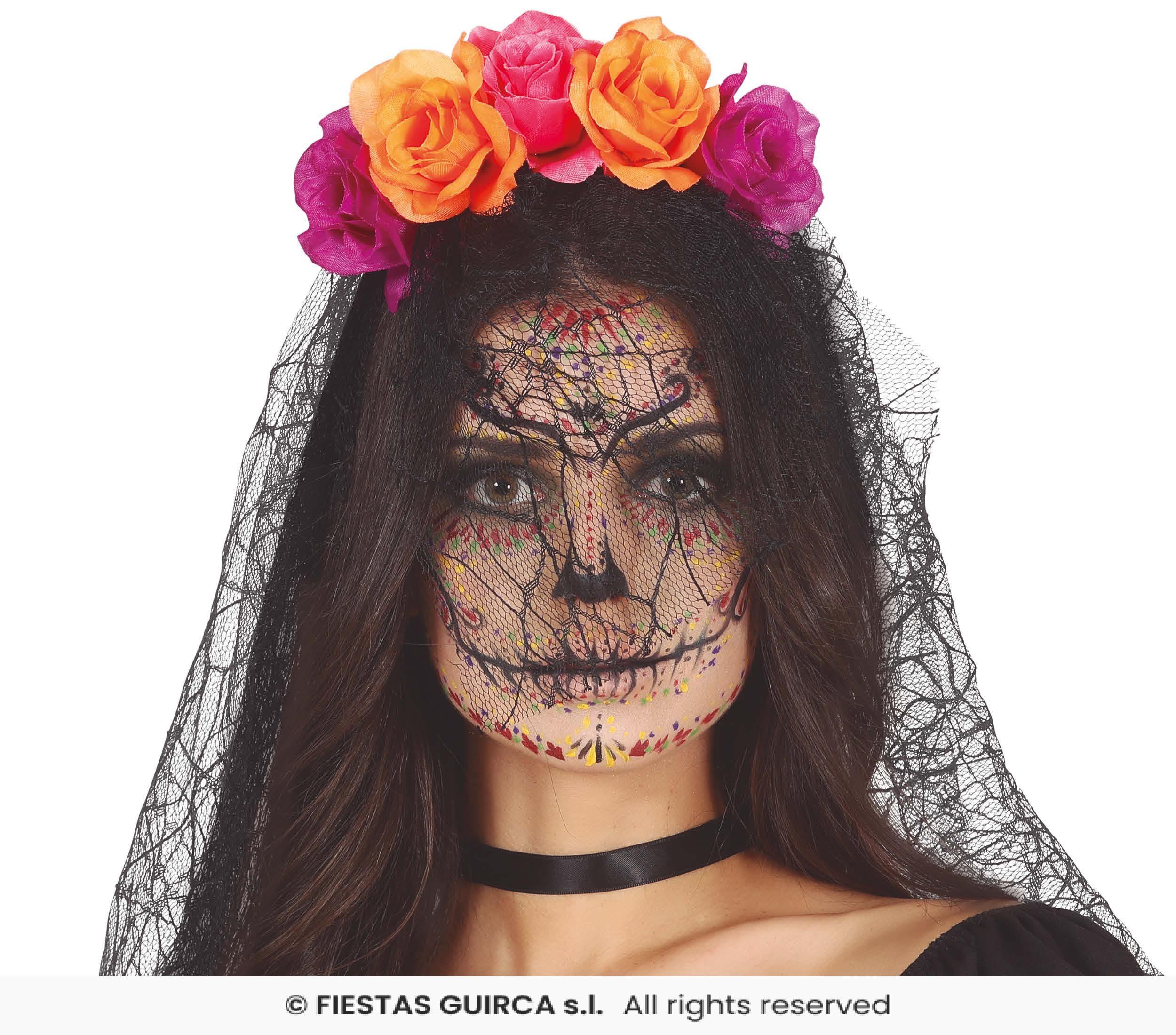 Disfrázate este Carnaval o Halloween de la muerte mejicana Catrina, y completa tu disfraz con esta diadema de flores en color lila y naraja, con velo en color negro integrado.Incluye:Diadema de flores