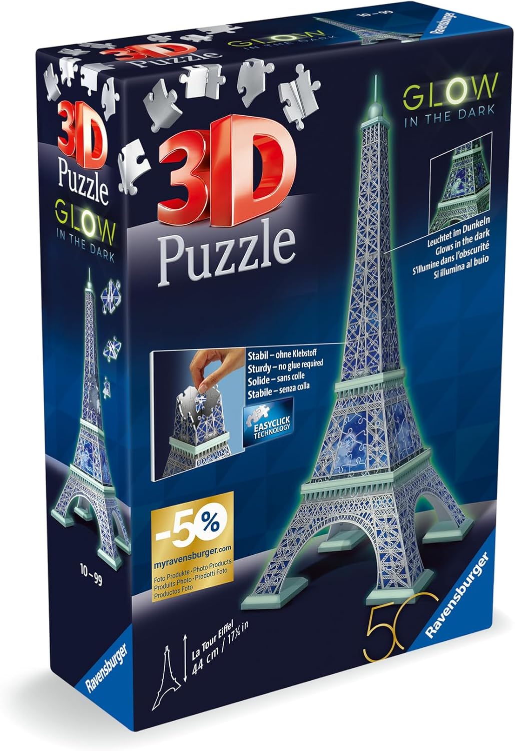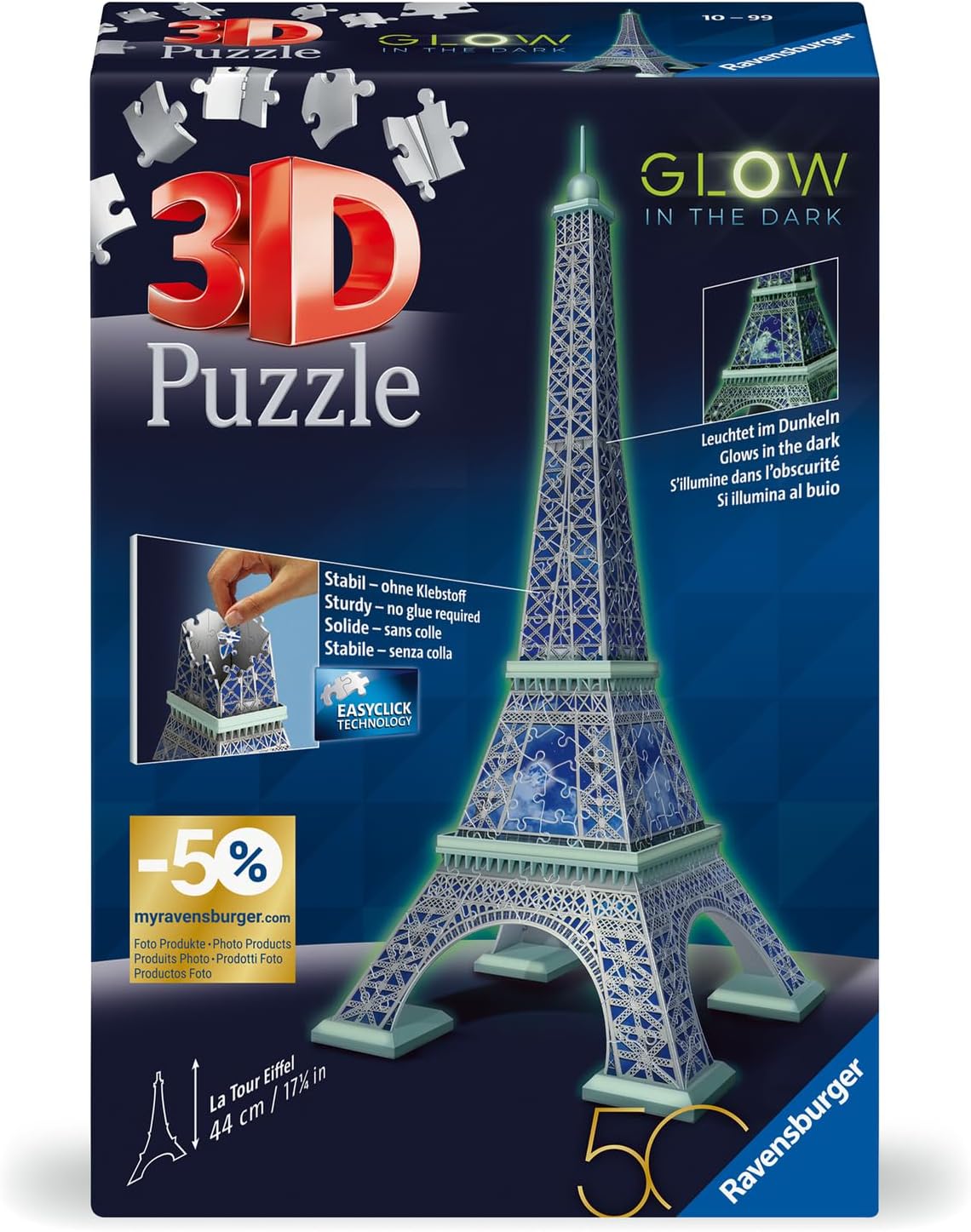 PUZZLE 3D: Descubre los monumentos más famosos del mundo, como la Torre Eiffel, pieza a pieza: ¡solo sigue los números y flechas en el reverso de cada pieza! MAQUETA TORRE EIFFEL: Monta este puzzle 3D de la Torre Eiffel de 216 piezas sin necesidad de pegamento, gracias a la precisión de las piezas de fibra de plástico, garantizando un montaje estable y preciso. EDICIÓN 50 ANIVERSARIO: Completa el puzzle 3D con los accesorios incluidos en la caja para obtener una réplica fiel del monumento original, perfecta para celebrar su 50 aniversario. BRILLA EN LA OSCURIDAD: Una vez ensamblado, la Torre Eiffel brilla en la oscuridad y puede utilizarse como un original objeto de decoración, iluminando cualquier espacio con su encanto icónico. NIÑOS 10 AÑOS HASTA ADULTOS: Sumérgete en la combinación de puzzles y construcción con estos innovadores puzzles en 3D de Ravensburger, que ofrecen una experiencia única para niños a partir de los 10 años y entusiastas de todas las edades.