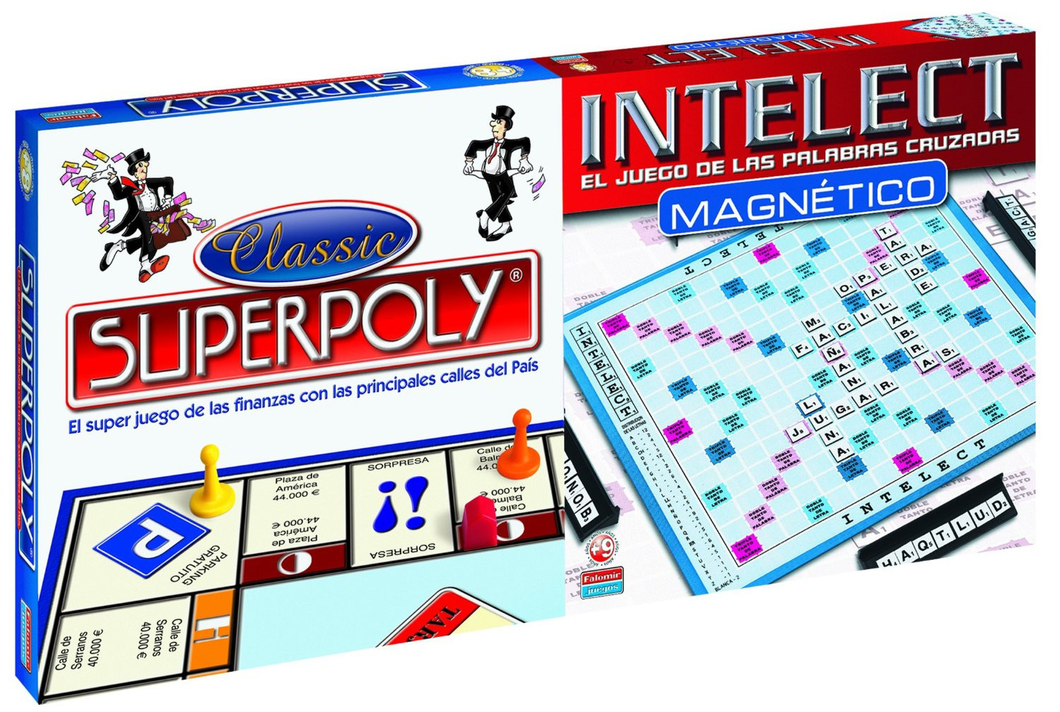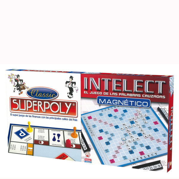 Superpoly: quieres pasar un rato entretenido? con superpoly de luxe euro, hazte con todas las propiedades posibles para ganar; con las principales calles del país; intelect magnético: el juego de palabras cruzadas donde dependes del azar al coger las letras y de tu habilidad en componer palabras para obtener la máxima puntuación; esta versión es magnética, para que no se caigan las fichas del tablero; contenido: tablero, 6 fichas de juego, 2 dados, 16 tarjetas sorpresa, 16 tarjetas caja, 1 mazo de billetes, 18 fichas hotel, 36 fichas casa, instrucciones, 1 tablero magnético, 98 fichas de letras magnéticas, 4 regletas.