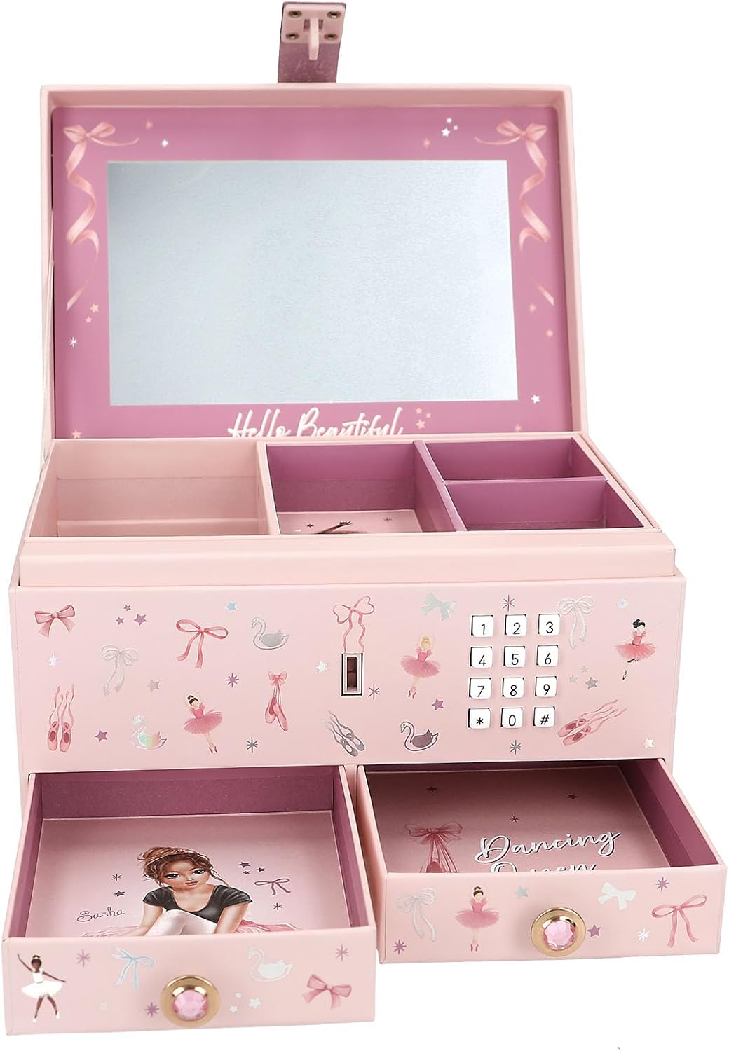 Equipado con tapa abatible, espejo, 2 cajones pequeños, una incrustación extraíble y otro compartimento debajo para disponer de espacio suficiente para organizar anillos, collares y otras piezas de joyería