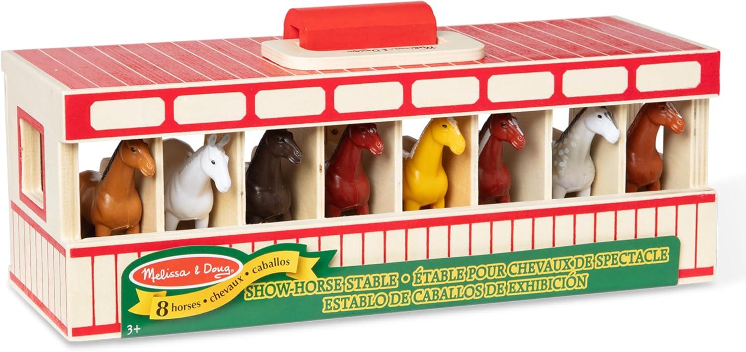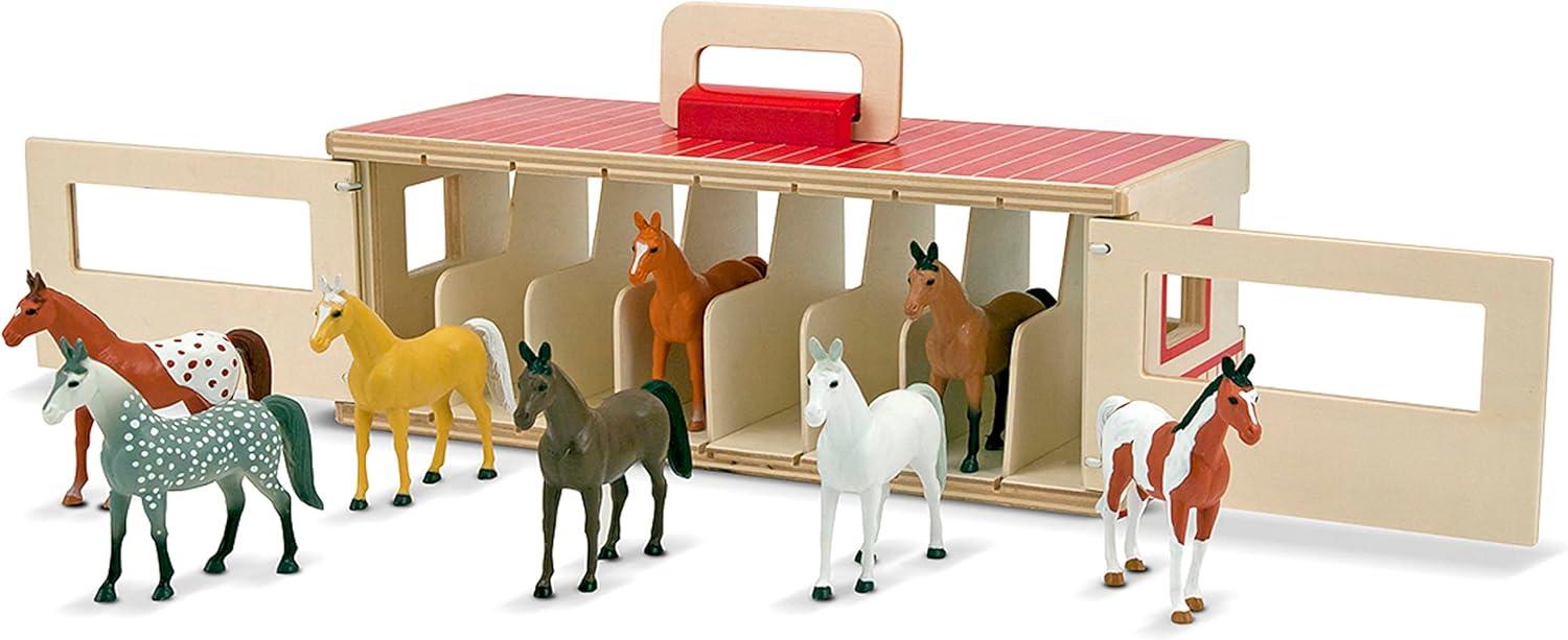 FOMENTA EL APRENDIZAJE CREATIVO: El juego de establo de caballos deexhibición de madera para llevar de Melissa & Doug incluye 8 preciosos caballos, un establo de madera transportable y una guía de cría de caballos