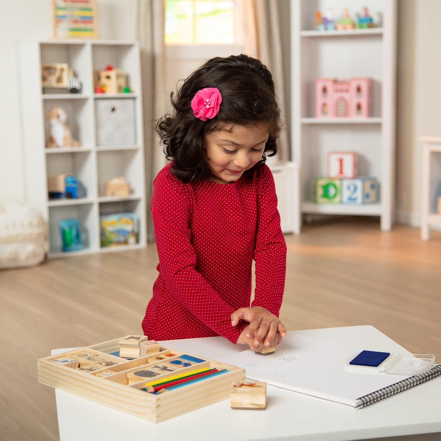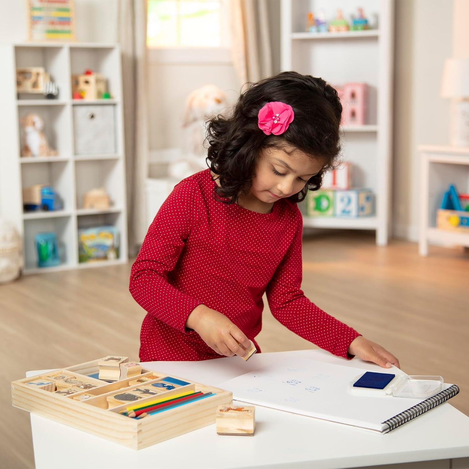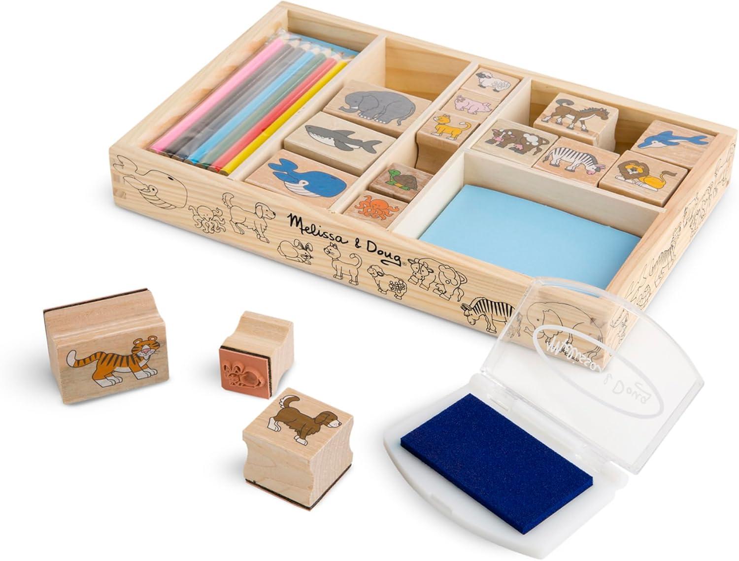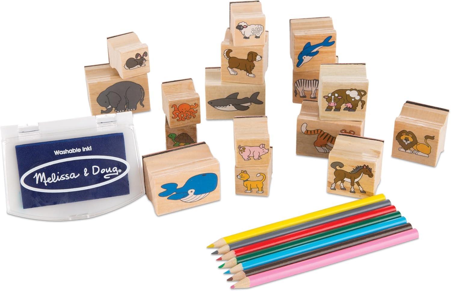 Juego de Sellos de Madera, Animales, 16 Sellos, 7 lápices y una Almohadilla de Tinta, Juguete Creati