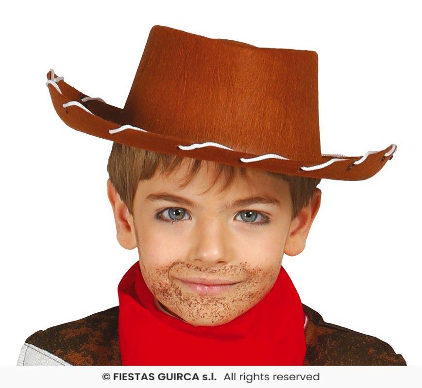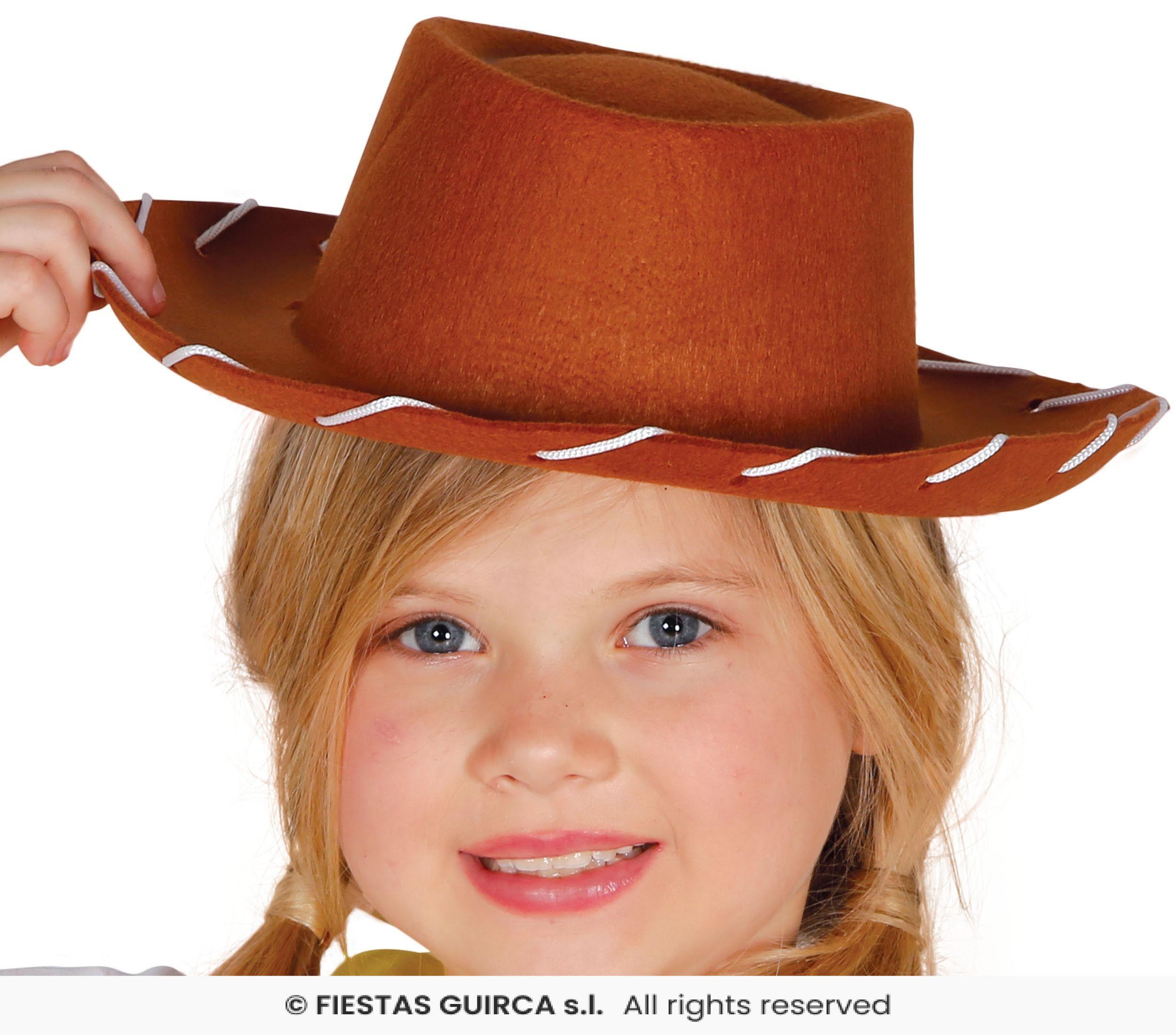 sombrero elaborado con fieltro en color marrón y decorado con cuerdas blancas a lo largo del ala. Si diseño nos recuerda a la vaquerita Jessie, compañera de Woody en la aventuras de Toy Story.