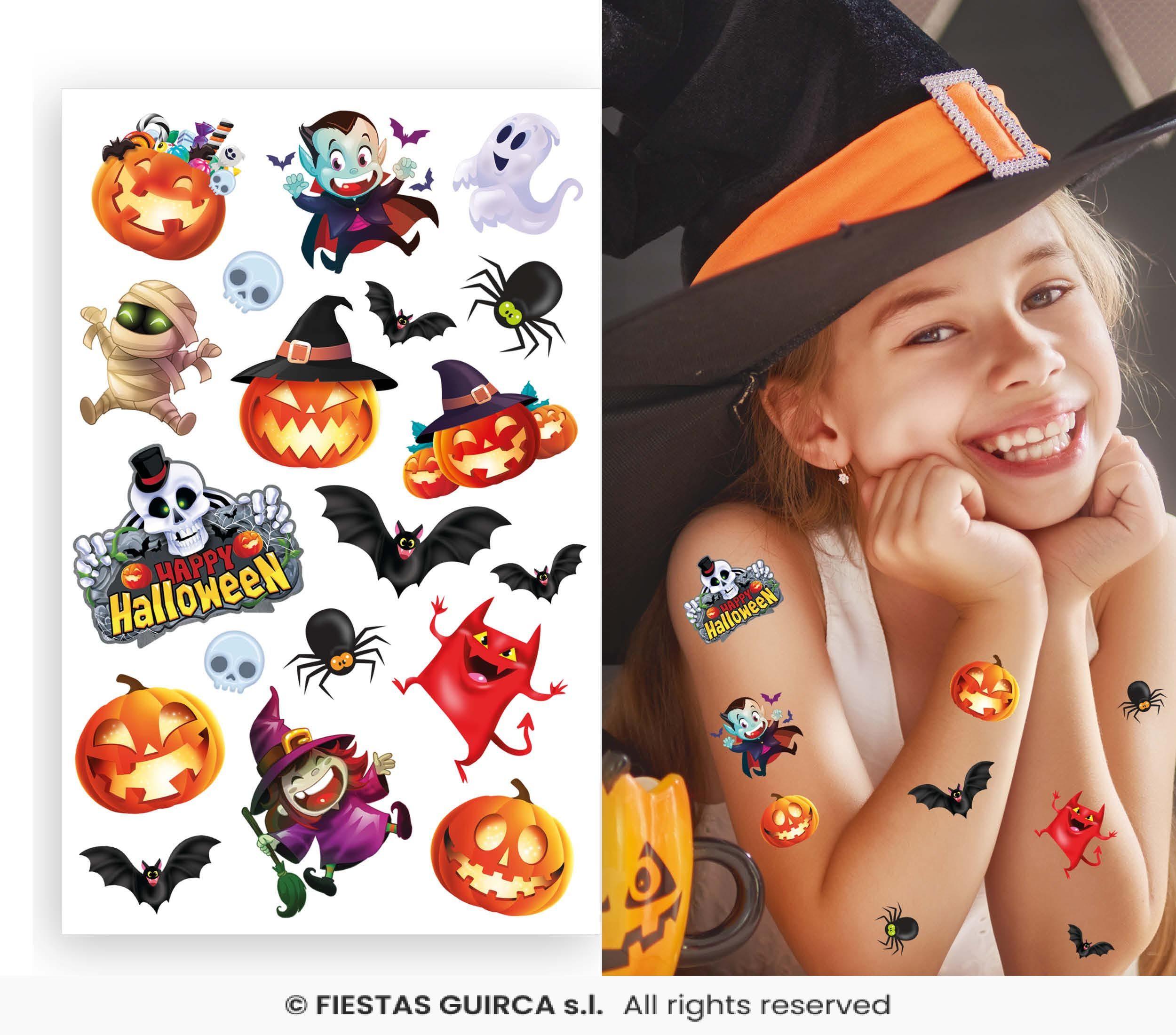 ¡Llena de alegría y color la noche más terroríficamente divertida del año! Este set de tatuajes temporales infantiles incluye diseños llenos de color y simpatía, con brujitas sonrientes, calabazas brillantes, arañas chistosas, fantasmas tiernos, murciélagos y muchos personajes más.