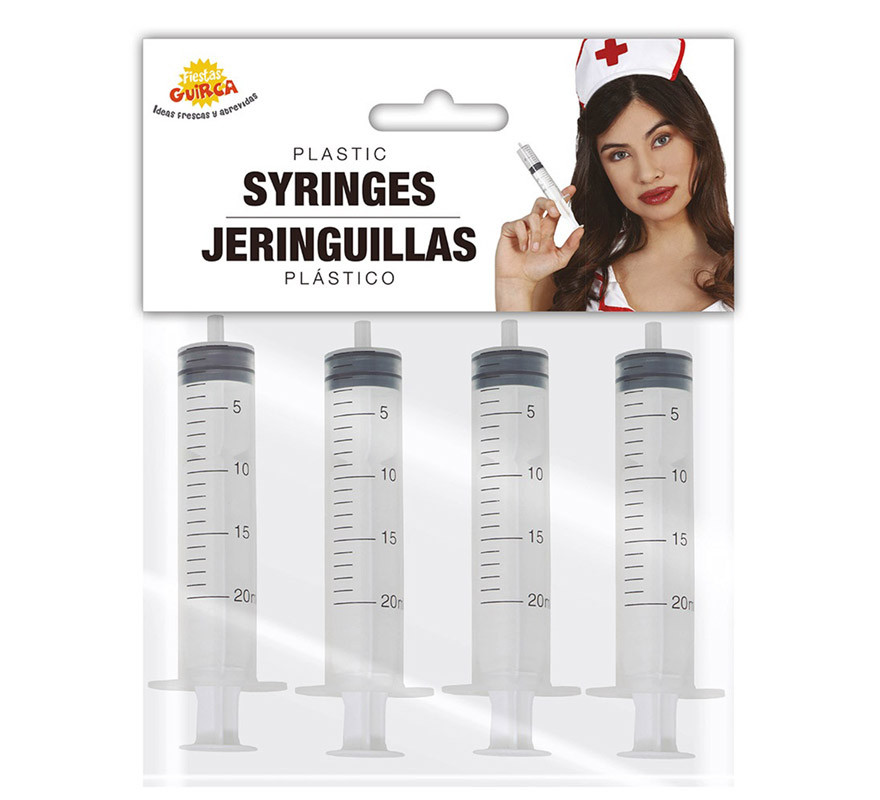 Pack de 4 Jeringuillas de 12 cm para carnaval y fiestas temáticas. Compra los complementos para tus disfraces de enfermera y médico: jeringas, termómetros, fonendos, etc… Consiste en una jeringuillas de plástico que imita a las que usan las enfermeras en los hospitales.