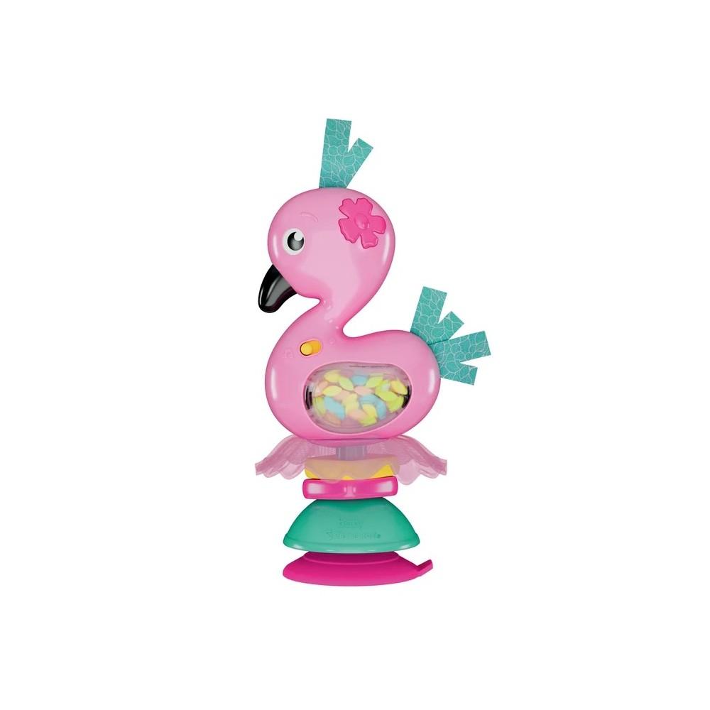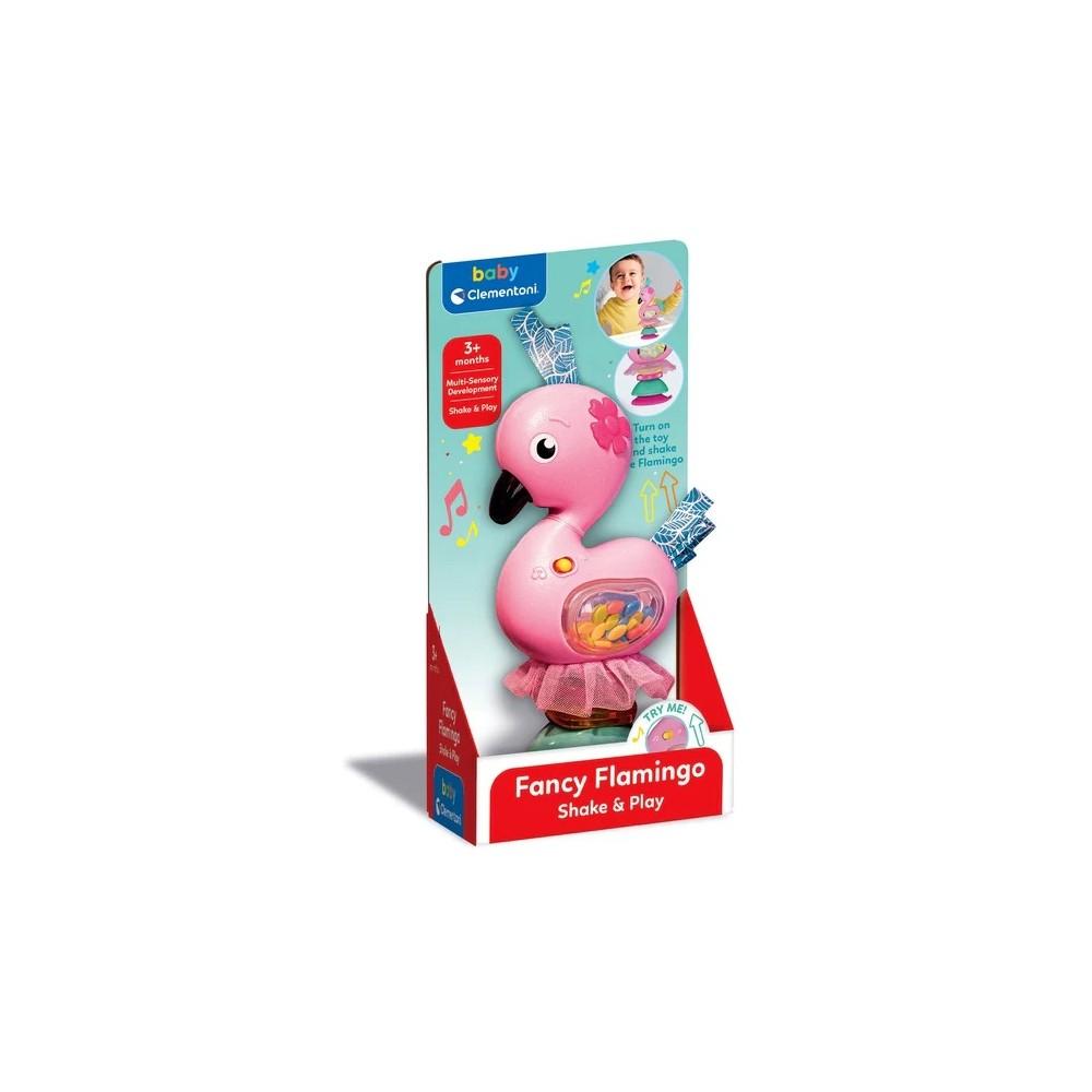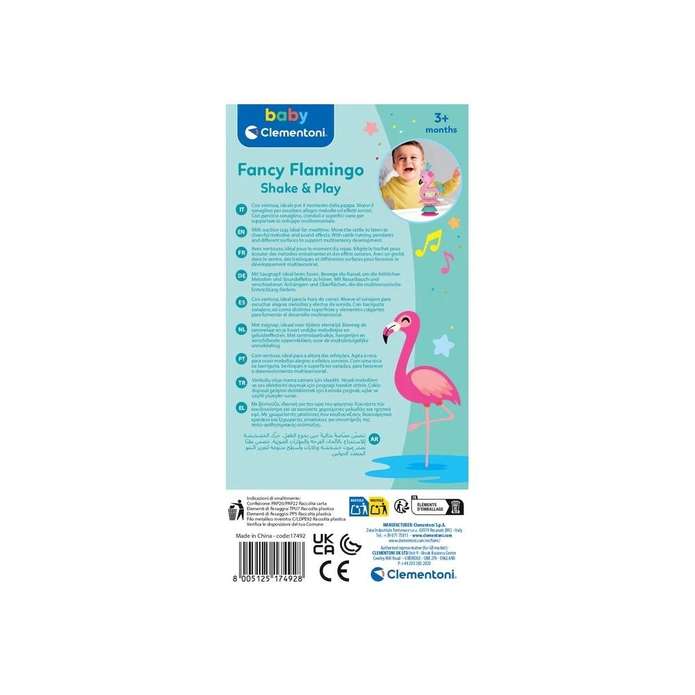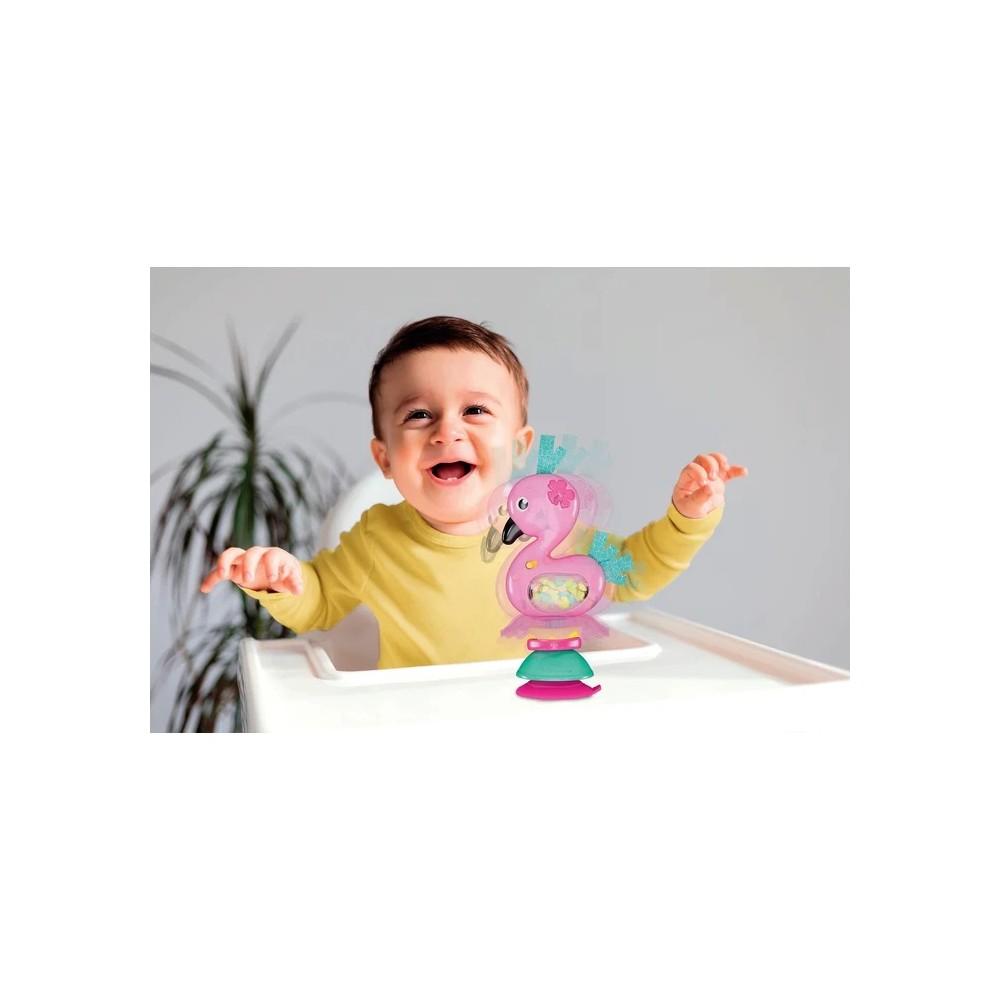 Un simpático sonajero con forma de flamenco para entretener al niño incluso en el momento de la comida. Cuando se mueve el sonajero, se activan alegres melodías y efectos sonoros, mientras que las bolas de colores y los colgantes atraen la atención del niño estimulando la percepción táctil. Con práctica ventosa para mantener el sonajero estable sobre la mesa o la trona durante la comida. Descubre toda la línea de sonajeros electrónicos Baby Clementoni Juguete apto a partir de 3 meses.