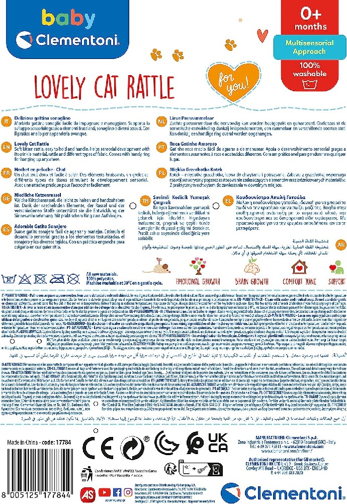 Fácil de coger y manejar, fomenta el desarrollo sensorial gracias a los elementos crujientes, al sonajero y a los diferentes tejidos