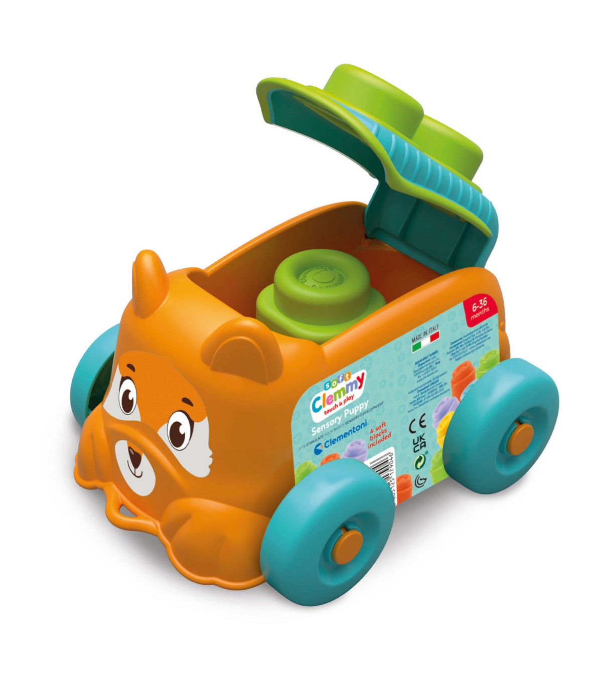 El perro es un buen soporte para transportar bloques. La tapa tiene inserciones hechas del mismo material que los bloques blandos, lo que permite fijar los bloques en ella. Contiene 4 bloques blandos de Clemmy. Las texturas en relieve estimulan el desarrollo sensorial del niño y le ayudan a mejorar su destreza manual. ¡Descubre todos los juegos sensoriales de la serie Soft Clemmy! Deje que su hijo juegue con total seguridad con Clemmy: material probado, apto para lavavajillas y muy suave.