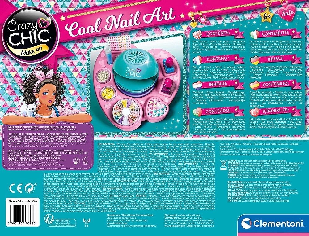 Contiene muchos esmaltes de uñas de colores, limas de uñas, purpurina y una selección de decoraciones de uñas.