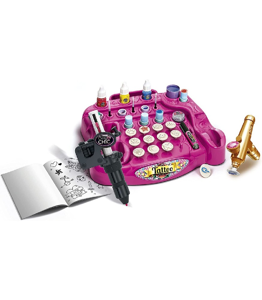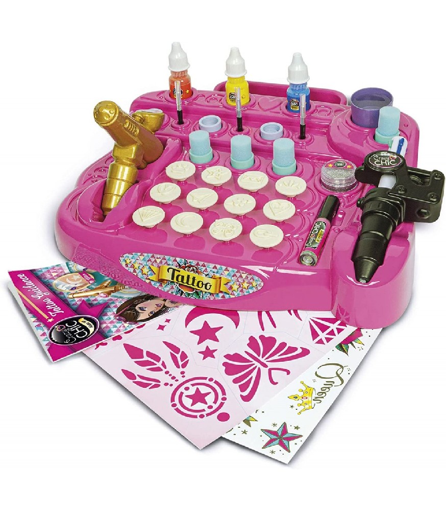 También contiene pinturas para el cuerpo para colorear los tatuajes, esponjas, aplicadores, plantillas y un libro de tatuajes con dibujos, consejos y hojas en blanco para tus tatuajes favoritos.
