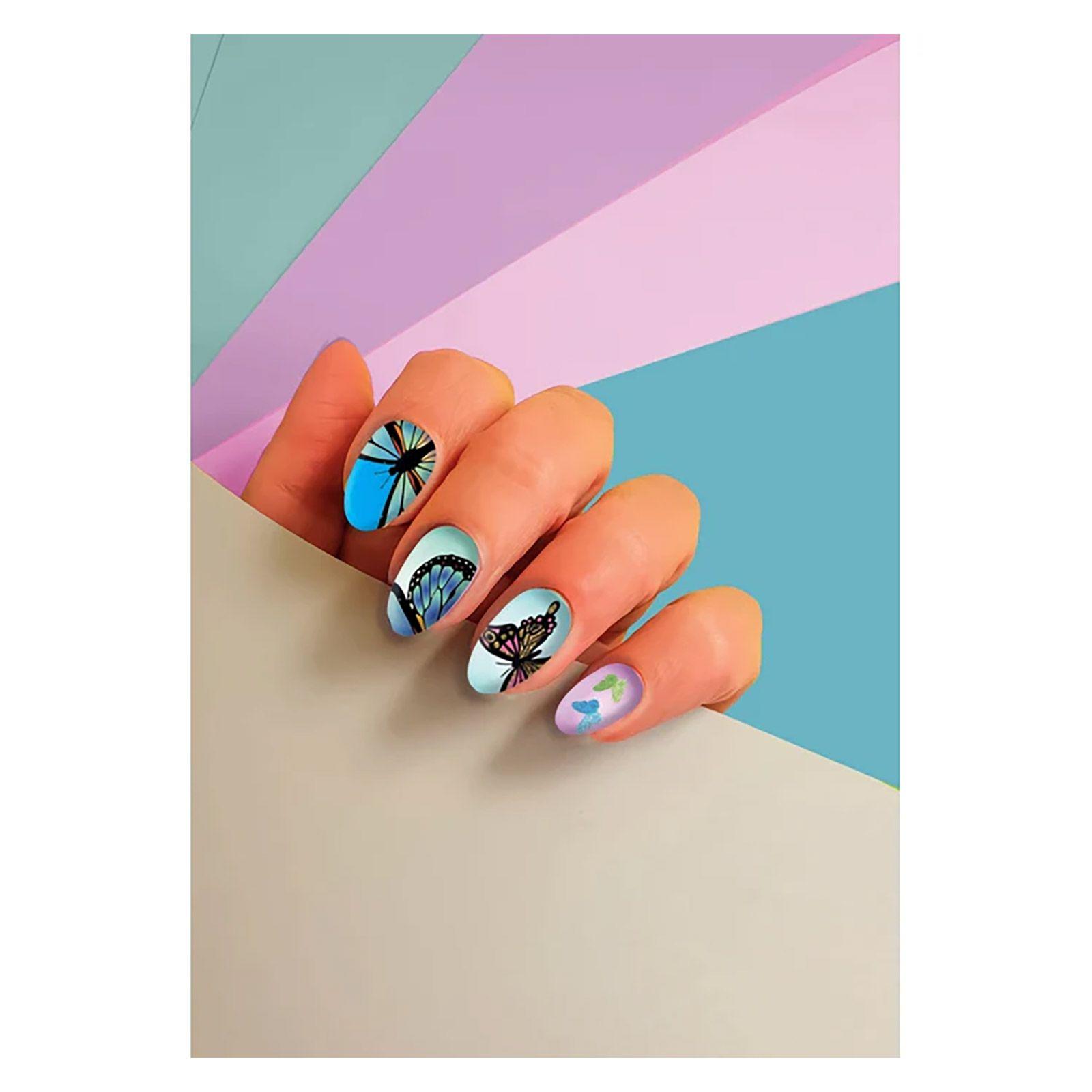 Un kit de uñas postizas para una manicura artística perfecta. el kit contiene 24 uñas de diferentes tamaños y formas en estilo «mariposa». un juego que estimula la creatividad de las niñas/os en el ámbito de la belleza.