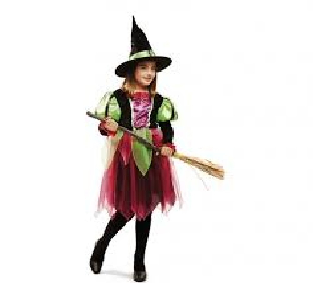 Disfraz de Brujita, Bruja o Hechicera fantasía para niña. Incluye vestido y sombrero. Ideal en fiestas de terror como Halloween.