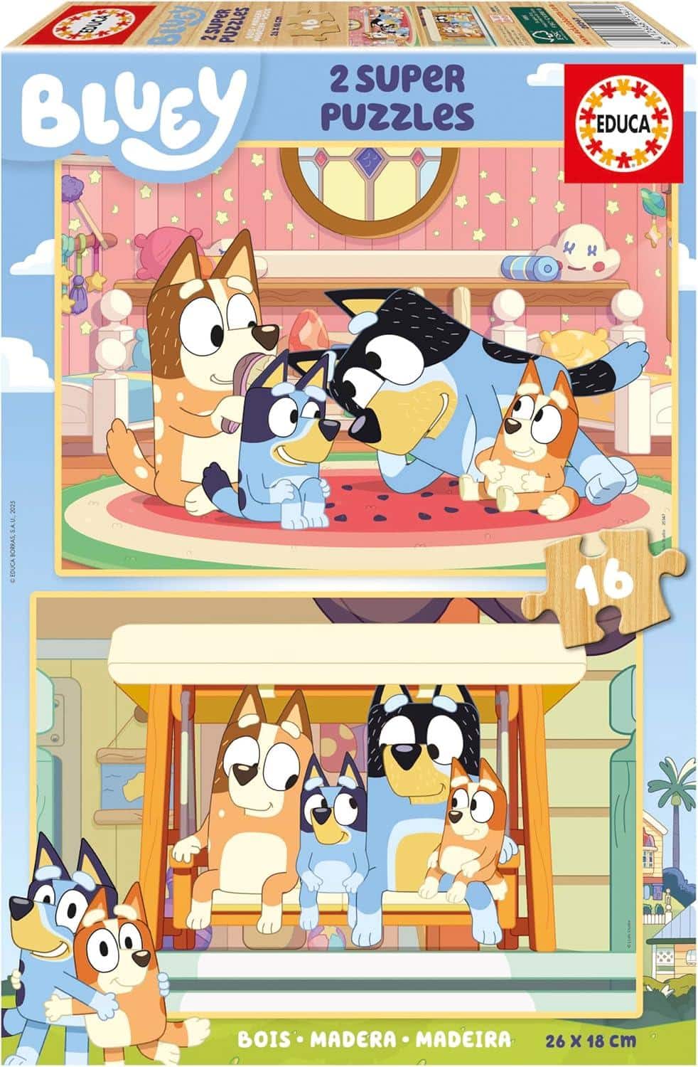 Educa – Set de 2 Puzzles Infantiles de Madera con 16 Piezas Cada uno. Bluey. Medidas: 26 x 18 cm. Recomendados a Partir de 3 años (20347)