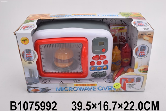 Microondas rojo de juguete con luz, giro interior y accesorios de comida. Incluye bandeja giratoria y sonidos simulados. Tamaño aprox. 39,5 × 16,7 × 22 cm. Perfecto para jugar a las cocinitas.
