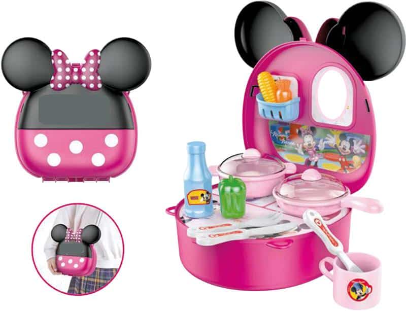 El Maletín Bolso Cocinita es un juego compacto y adorable que se convierte en una completa cocinita infantil. Incluye cazos, sartenes, utensilios, alimentos de juguete y accesorios para que los peques disfruten cocinando como en casa. Su diseño en forma de bolso con orejas y lazo de Minnie permite llevarlo a cualquier parte.