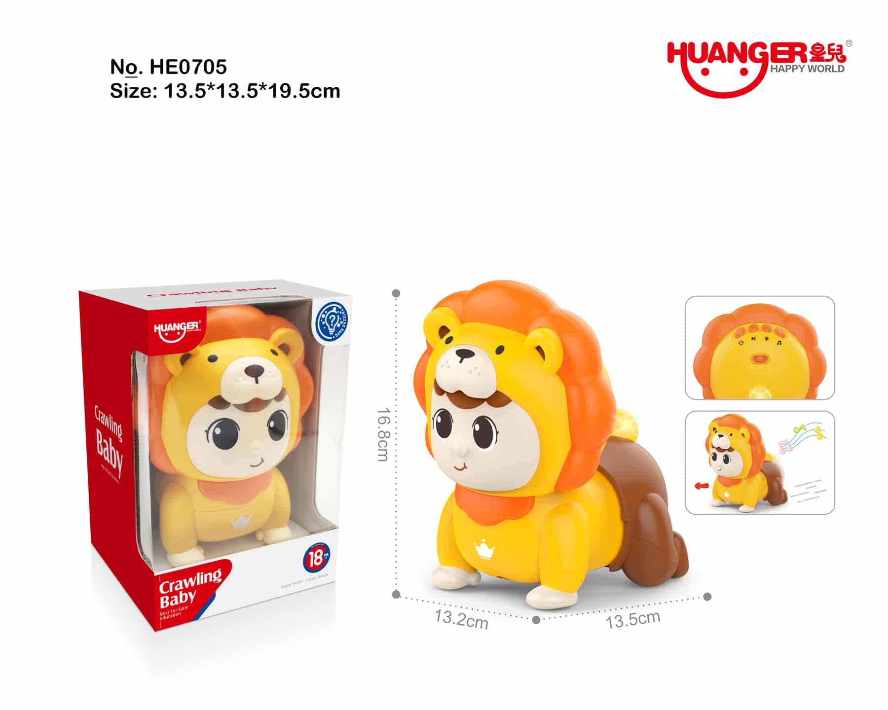 Muñeco andador para bebé tipo crawling baby, diseñado para estimular el movimiento y el gateo. Con forma de león, colores llamativos y tamaño adaptado a manos pequeñas. Al desplazarse, anima al bebé a seguirlo, favoreciendo el juego activo. Fabricado con materiales resistentes y seguros. Medidas aproximadas: 13,5 × 13,5 × 19,5 cm. Recomendado a partir de 18 meses.