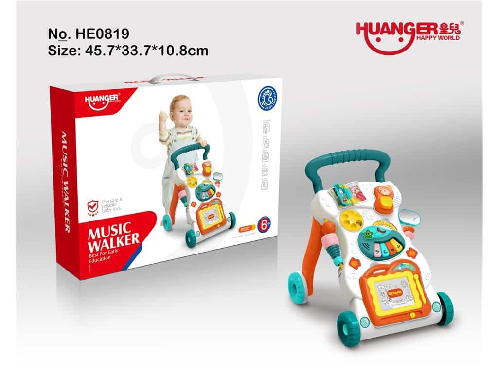 Andador musical para bebés con sonidos y pizarra. Diseñado para ayudar en los primeros pasos, incluye actividades educativas que entretienen y motivan al niño mientras camina y juega.