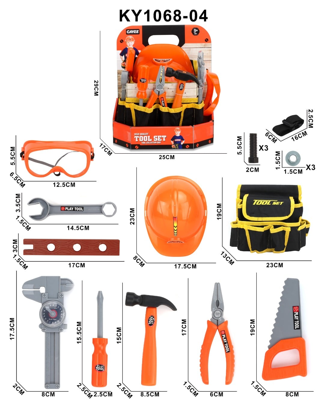 Completo set de herramientas para niños con cinturón, casco y accesorios. Ideal para jugar a ser constructor, mecánico o técnico, fomentando el juego activo y de imitación.