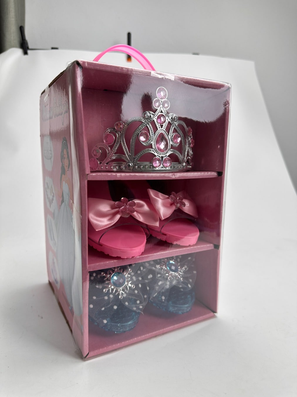 Un precioso set para que los peques se sientan auténticas princesas. Incluye corona brillante, zapatitos rosas y zapatitos transparentes, todo presentado en una caja expositora perfecta para regalar. Ideal para juegos de disfraces, imaginación y momentos mágicos.