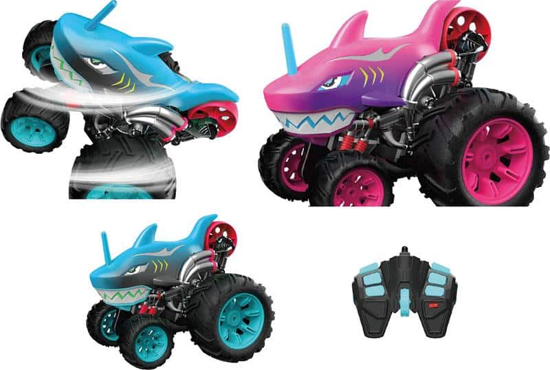 Coche RC con diseño de tiburón azul, capaz de hacer piruetas, giros rápidos y acrobacias 360º gracias a sus ruedas todoterreno y su suspensión elevada.