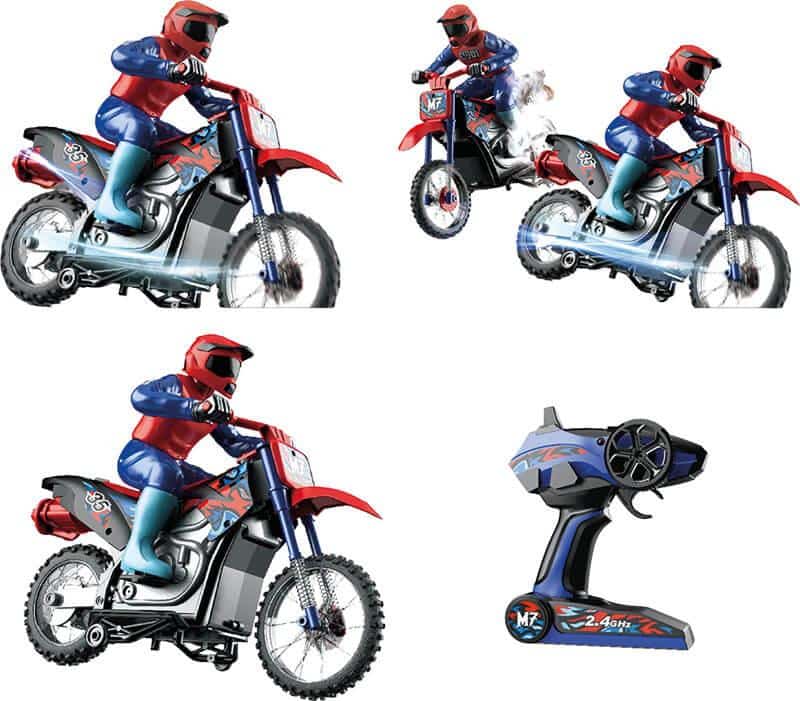 Moto teledirigida gigante de 35 cm con luces LED y espectacular efecto de humo. Sistema 2.4 GHz para control preciso y sin interferencias. Diseño realista tipo trail, piloto articulado y ruedas todo terreno para saltos, derrapes y acrobacias. Incluye batería recargable y cargador USB.
