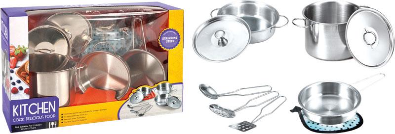 Juego de cocina infantil de 9 piezas de aluminio con ollas, sartenes, tapas y utensilios metálicos. Acabado realista y resistente para jugar como los mayores. Ideal para cocinitas, juego simbólico y regalo.Perfecto para regalar y disfrutar en casa o al aire libre.