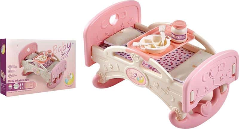 Cuna balancín para muñecas en color rosa, resistente y con diseño clásico. Incluye bandeja superior con accesorios de comida para jugar a cuidar al bebé. Perfecta para juego simbólico.