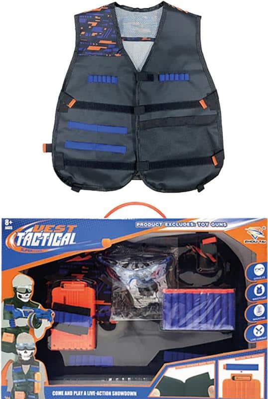 La Caja Chaleco Táctico compatible con NERF con Accesorios es el complemento perfecto para los niños que disfrutan de los juegos de acción y aventura. Incluye un chaleco ajustable de diseño táctico, fabricado en material resistente y transpirable, además de una selección de accesorios como cargadores, dardos de espuma y elementos de sujeción para que los peques disfruten de una experiencia de juego completa.