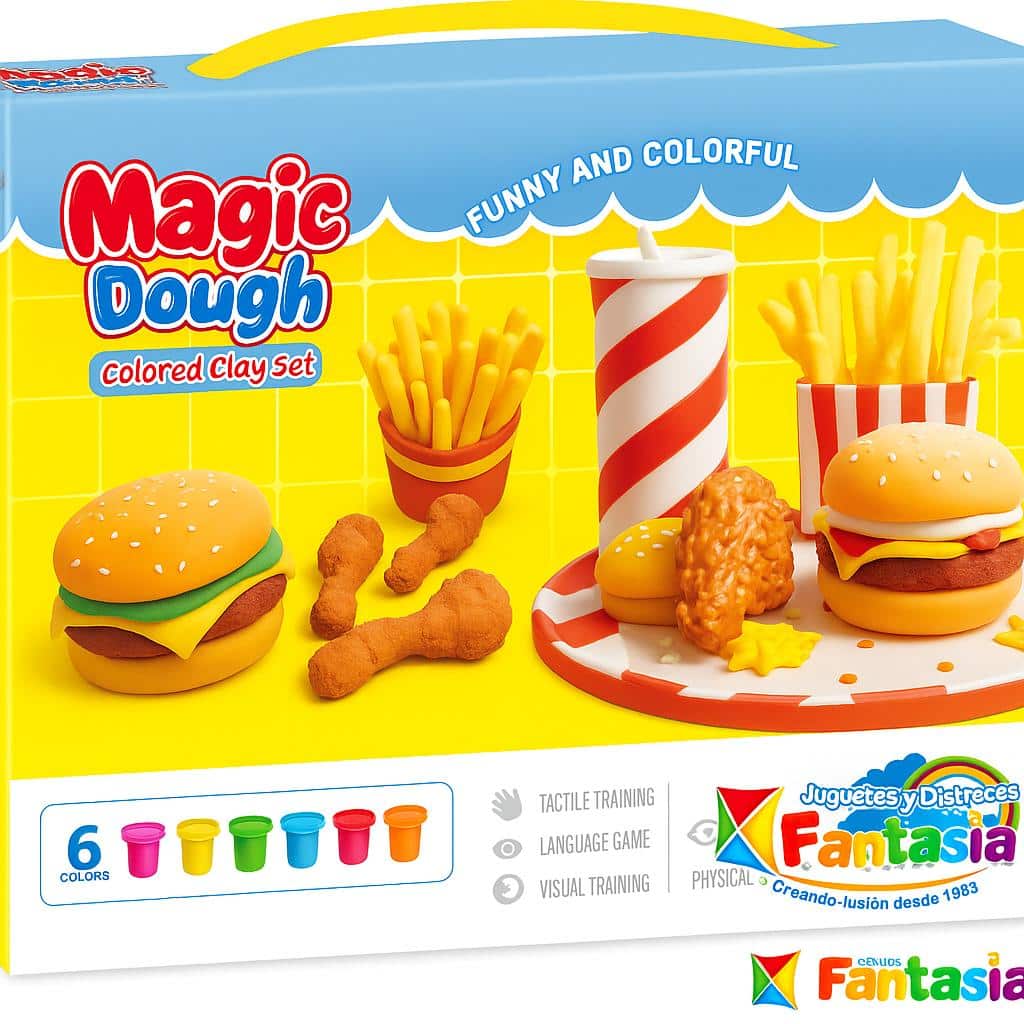 Set de plastilina Magic Dough con temática de hamburguesas y comida rápida. Incluye 6 botes de plastilina de colores, moldes y herramientas para crear hamburguesas, patatas, refrescos, alitas y muchas figuras divertidas.
