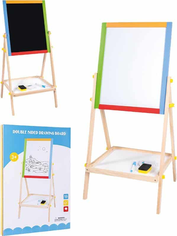 Pizarra de madera de doble cara: blanca para rotulador y negra para tiza. Incluye bandeja inferior, accesorios básicos y estructura estable. Perfecta para dibujar, aprender letras y fomentar la creatividad.