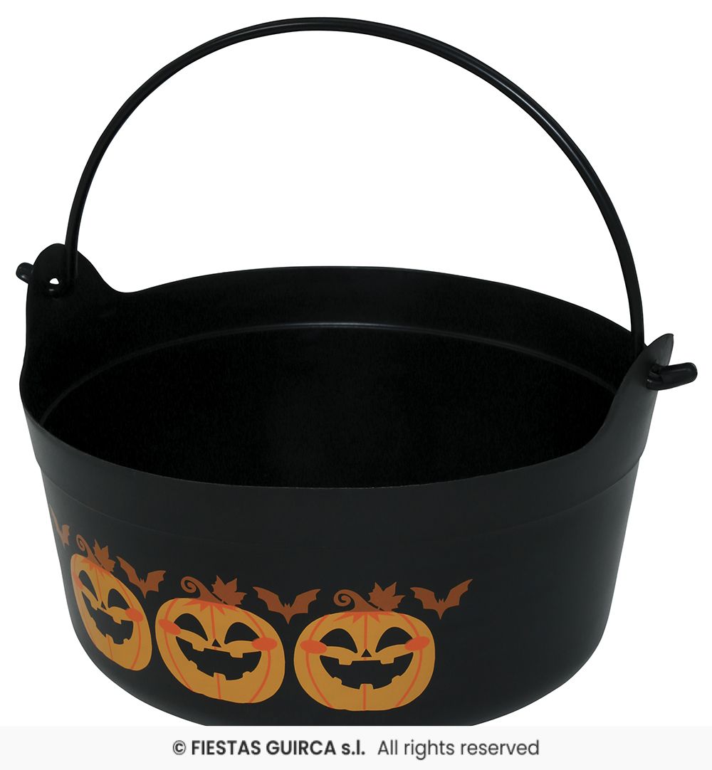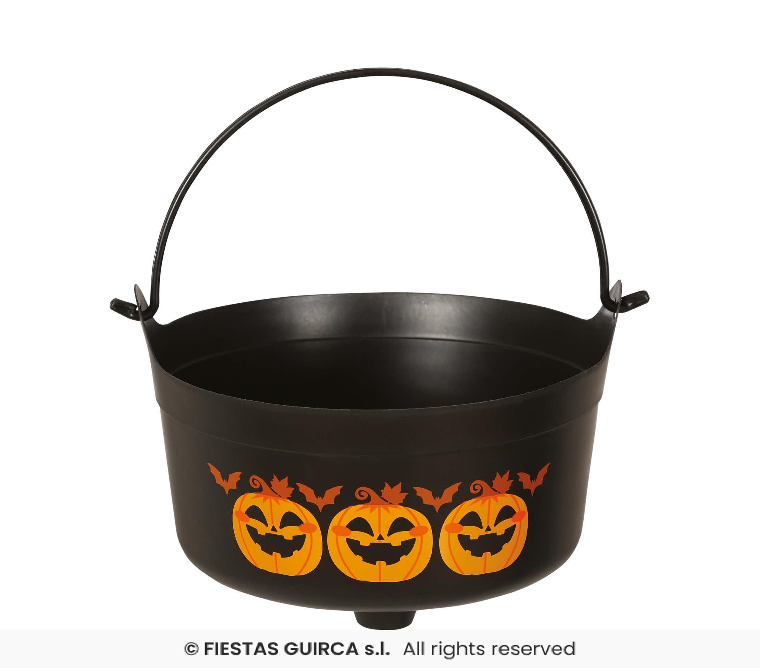 Este es un gran caldero que nos recuerda al típico que usaban las brujas para hacer su pócimas. Es de plástico negro y lo podrás usar para recoger chucherías o como elemento decorativo para cualquier mesa. Medidas reales
