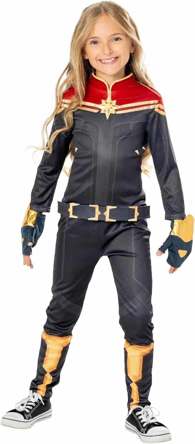 Disfraz Capitana Marvel deluxe para niñas talla 5-6 años incluye jumpsuit con detalles impresos digitalmente, insignia moldeada de color plateado icónica de Capitana Marvel y 2 guanteletes