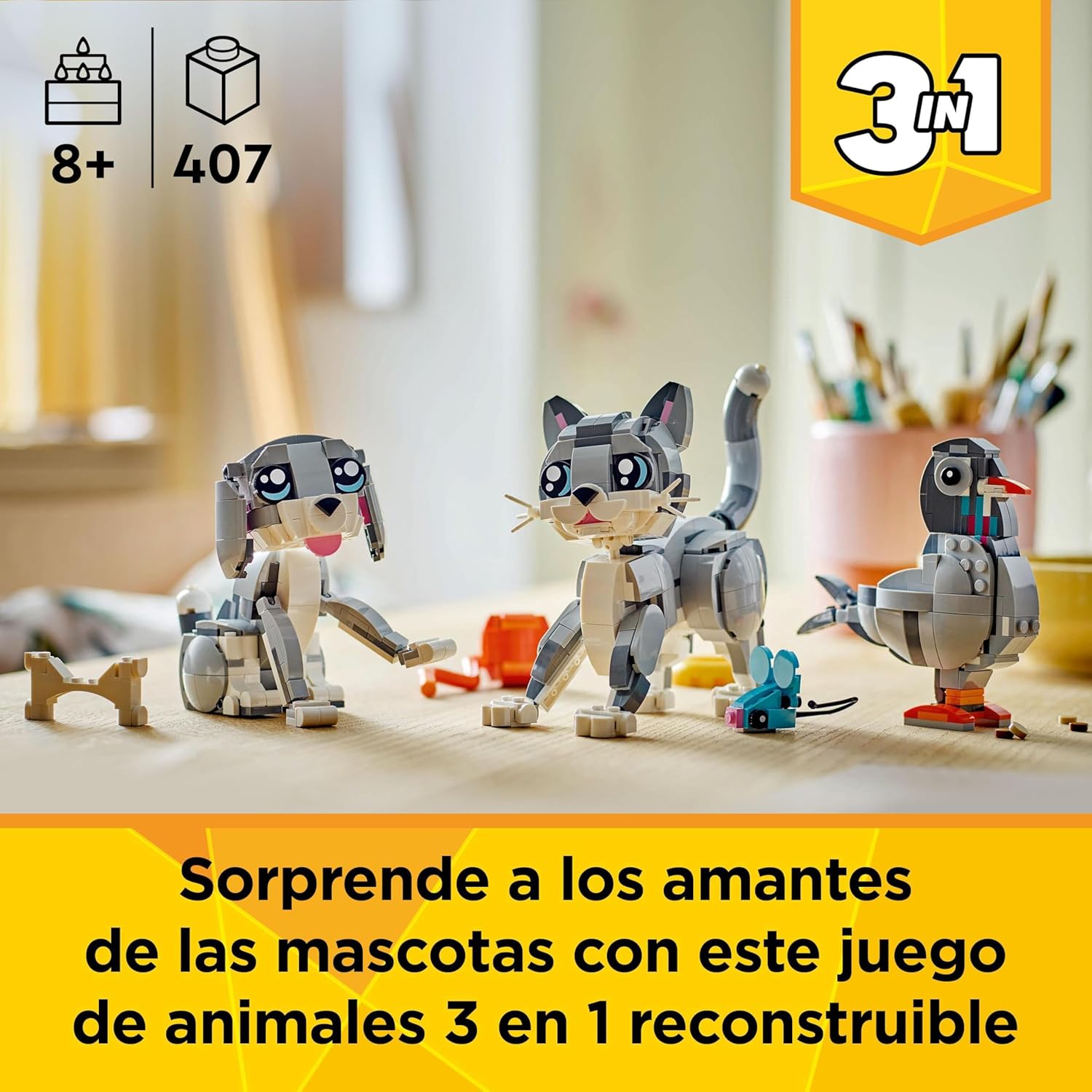 LEGO Creator 3 en 1 Gato Juguetón Transformable en Perro de Juguete o Paloma, Juego con Animales, Figuras Articuladas, Regalo de Cumpleaños para Niñas y Niños de 8 Años o Más 31163