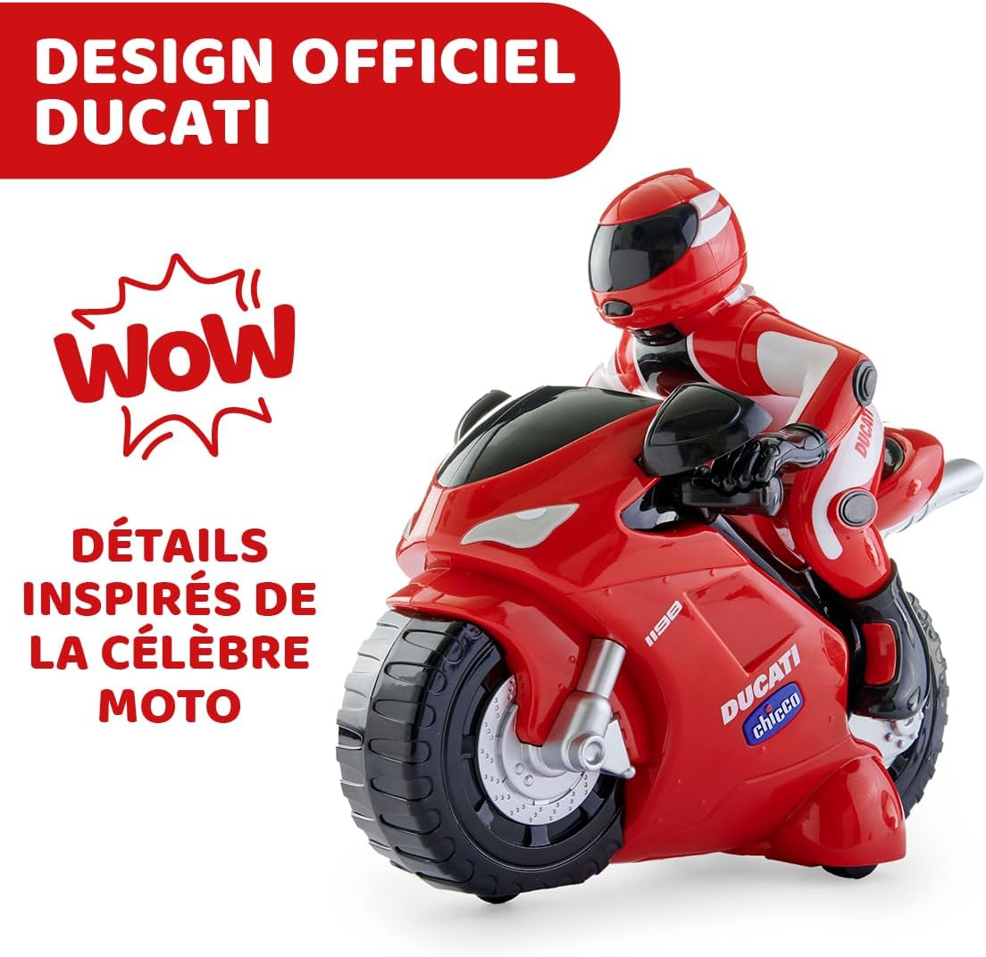 DISEÑO DEPORTIVO: Disfruta como un auténtico motero con la famosa Ducati 1198 de Chicco y su manillar radiocontrol muy realista: salpicadero, parabrisas y sonidos.