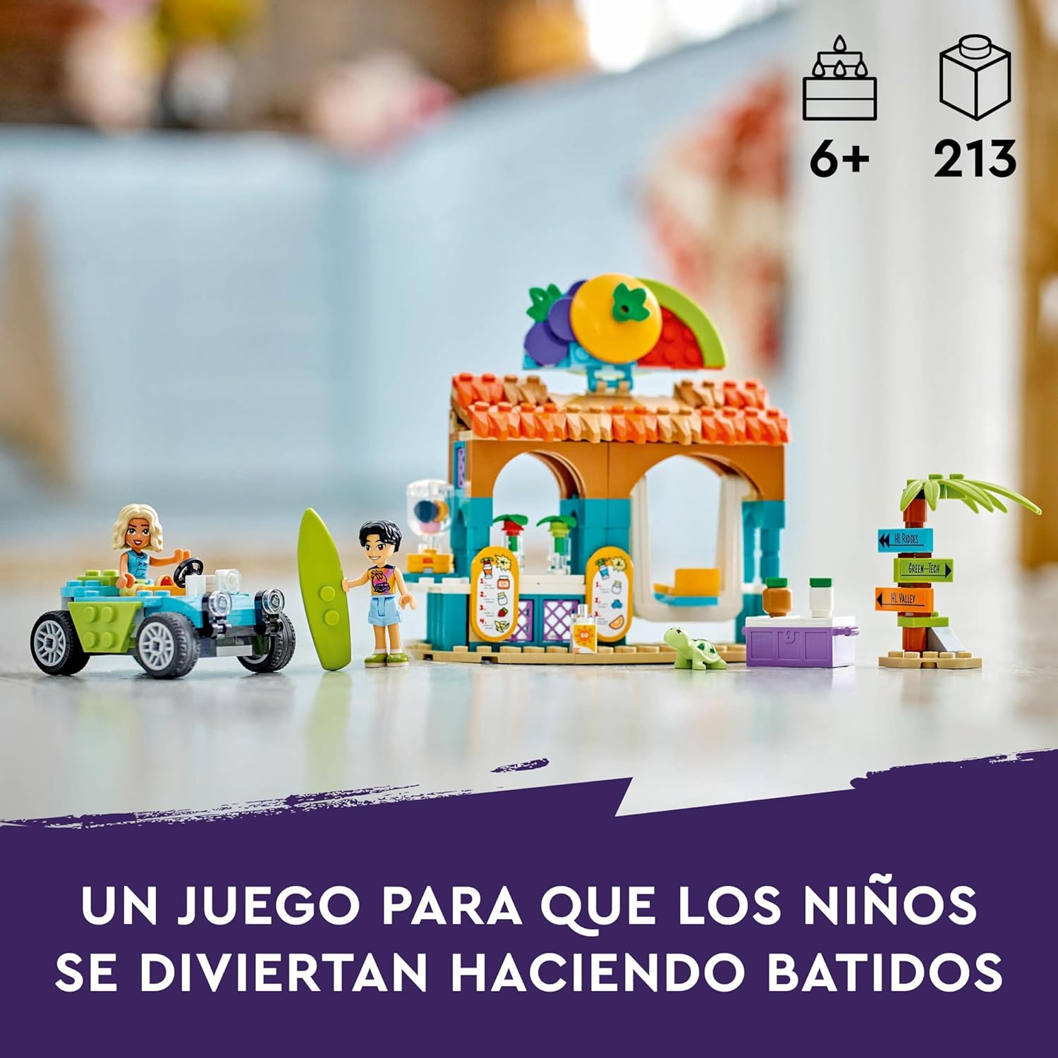 LEGO Friends Puesto de Batidos de la Playa, Regalo para Niñas y Niños de 6 Años o Más con 2 Mini Muñecos para el Juego de rol, Comida de Juguete, Tabla de Surf Figura de Tortuga y Buggy 42625