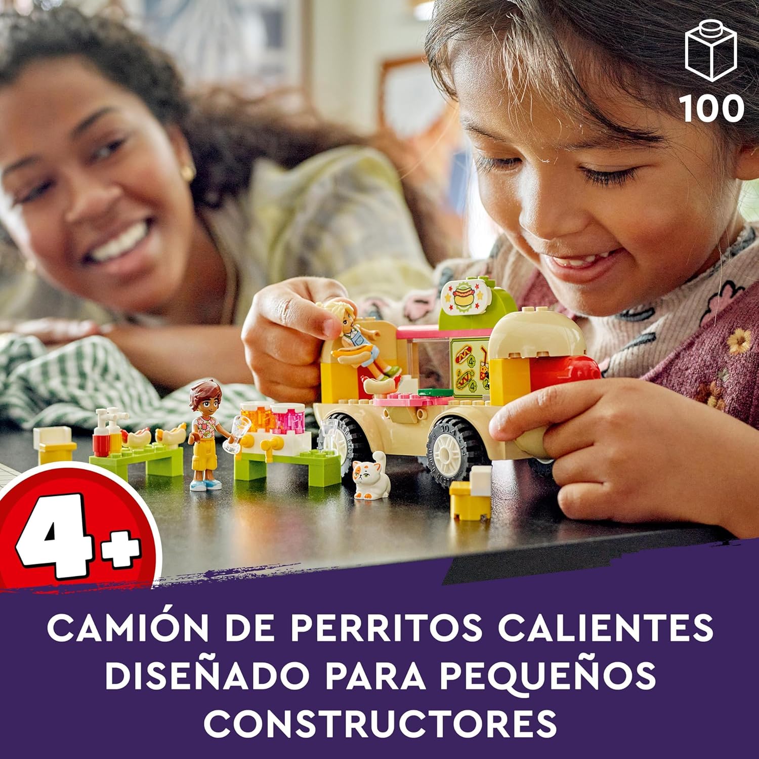 LEGO Friends Camión de Perritos Calientes Food Truck y Accesorios de Comida y Cocina de Juguete con Figura de Gato y Mini Muñecos de Personajes, Regalo para Niñas y Niños de 4 Años o Más 42633