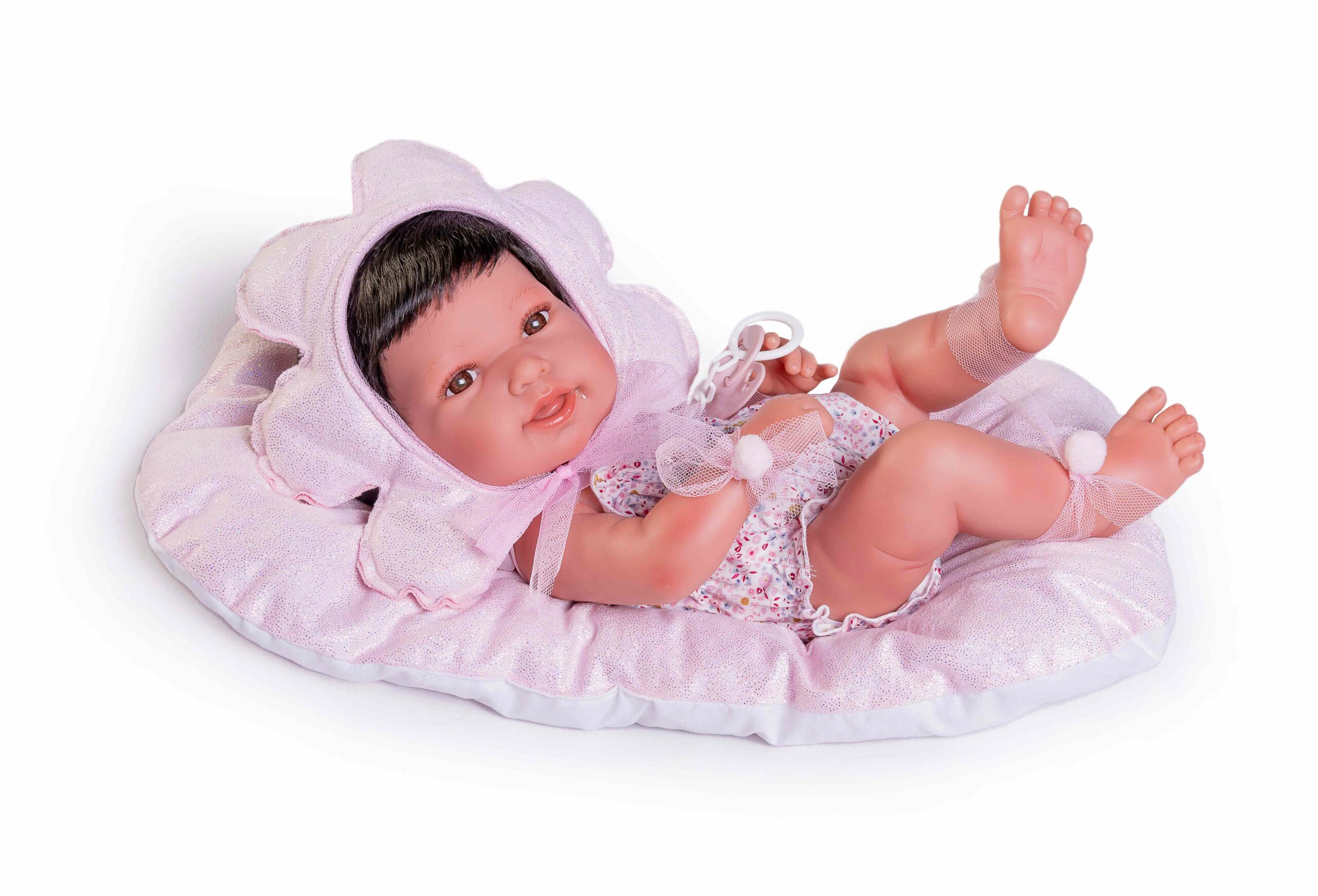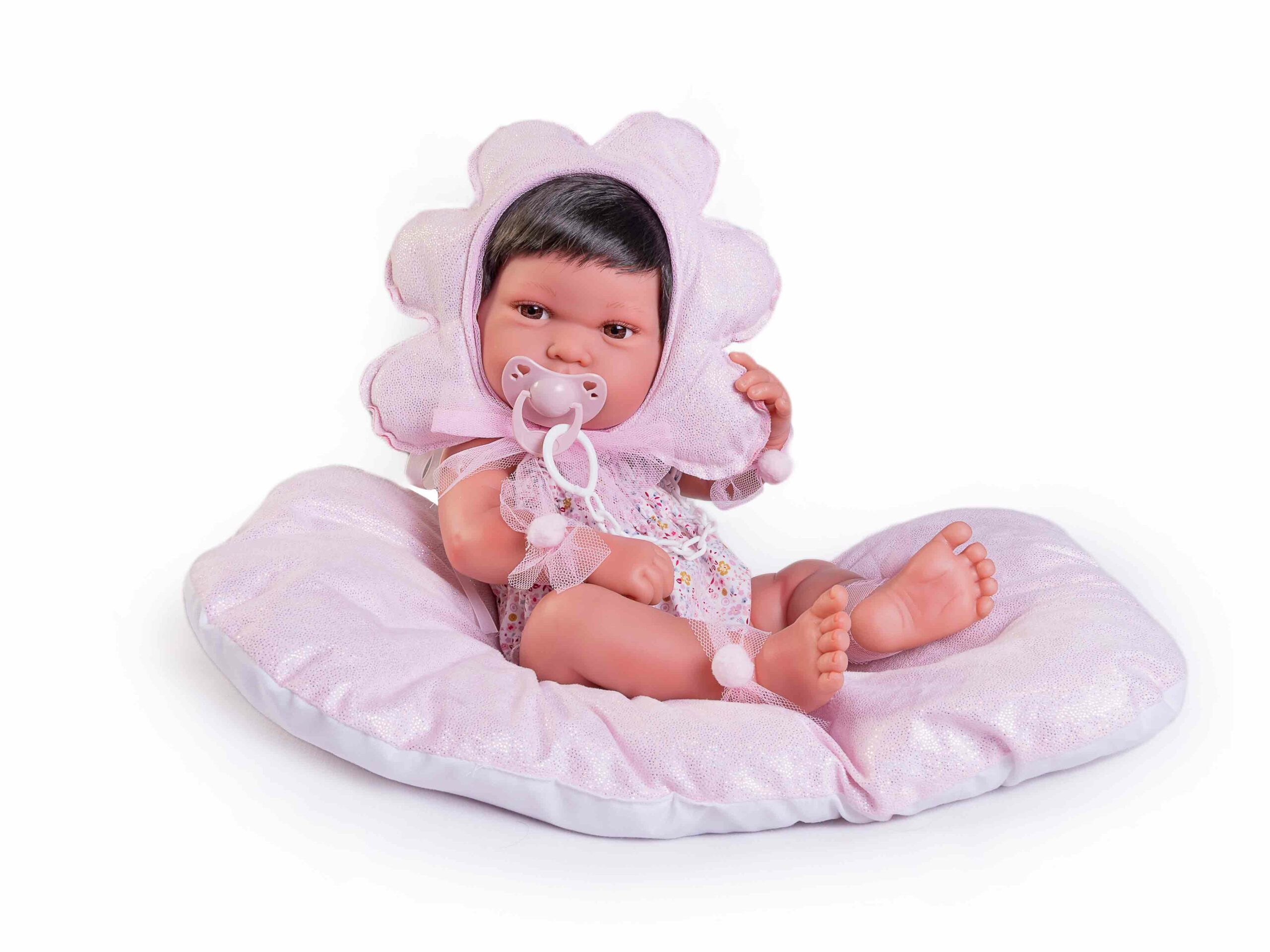 Pipa es una recién nacida muy divertida, que hoy ha querido disfrazarse de flor. Su tela es brillante, asi que ¡Pipa resplandece! Lleva un pelele de florecitas y le gusta tumbarse en su cojín a jugar. Lleva unos complementos con pompón en sus manos y pies. y le encantará que la abraces para dormir. ¿Hay algo más adorable que un bebé? Los Recién Nacidos son la esencia de Muñecas Antonio Juan. Un universo de dulzura creados para acompañar a los más pequeños a descubrir el mundo. Compañeros inseparables de largos días de juegos a los que no les falta detalle en sus tiernas facciones y calidad de su ropita y complementos.