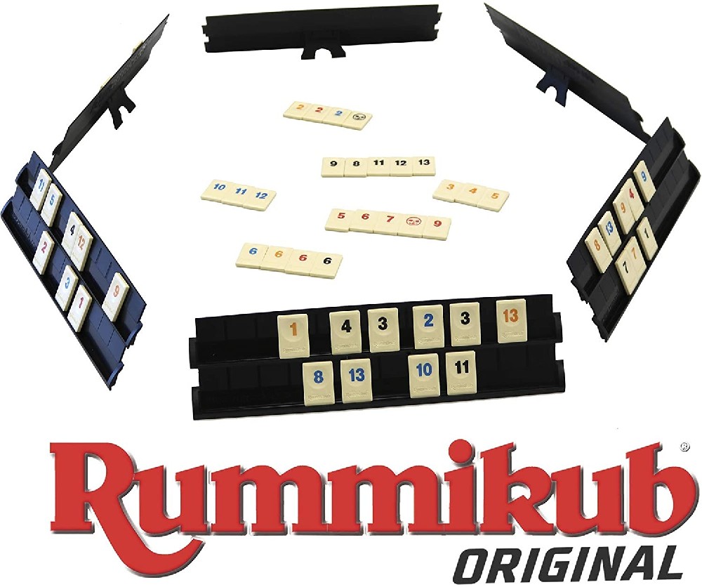 ¡El famoso juego de números para todas las edades! Jugar es muy sencillo. Coges un grupo de fichas, según los jugadores que participéis, y se trata de hacer grupos de números. Bien un grupo del mismo número pero con distinto color, o bien números consecutivos pero del mismo color, lo que en las cartas se conoce como tríos o escaleras. Lo primero, cada jugador coge 14 fichas del montón común y las coloca en su soporte. Para empezar a hacer tríos o escaleras sobre la mesa, deberás hacer una primera jugada que sume al menos 30 puntos. Esto es, hasta que en tu soporte no tengas tríos o escaleras que sumen 30, no puedes »bajar». A partir de este momento ya puedes seguir poniendo mas grupos de fichas o bien poner fichas tuyas en grupos que hayan hecho otros. Si no puedes poner ninguna ficha en tu turno, robas una. Y así hasta que consigues quedarte sin fichas en tu soporte. Si lo consigues el primero eres el ganador… ¡enhorabuena!