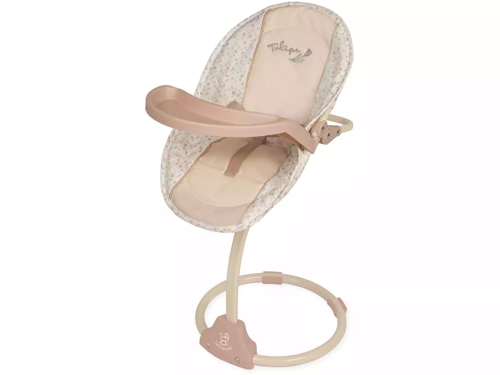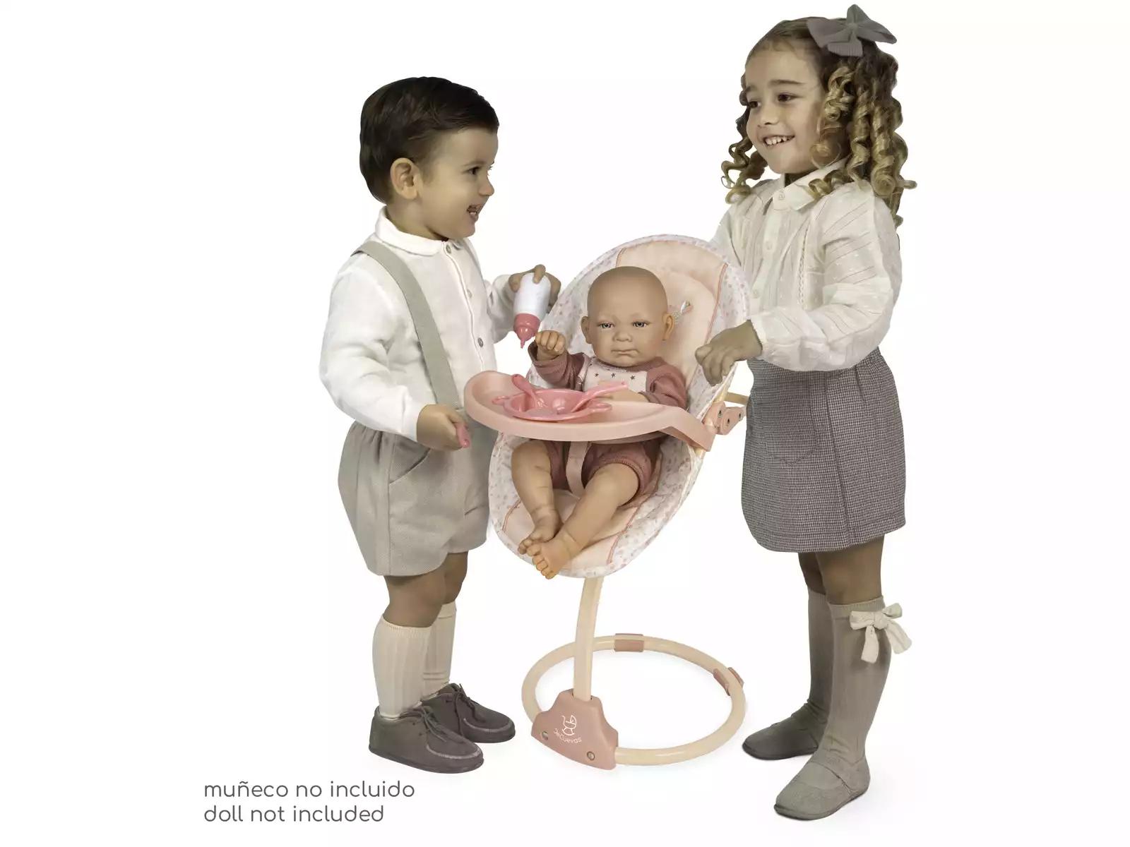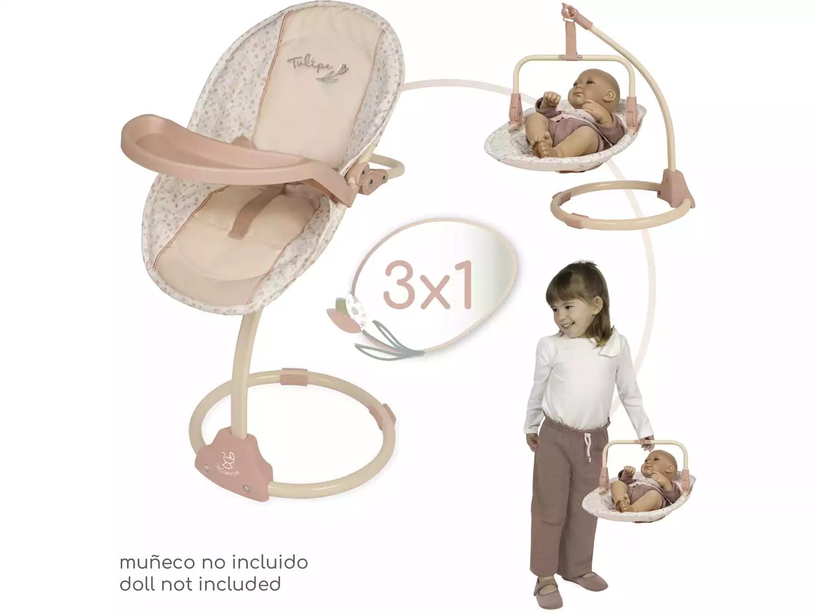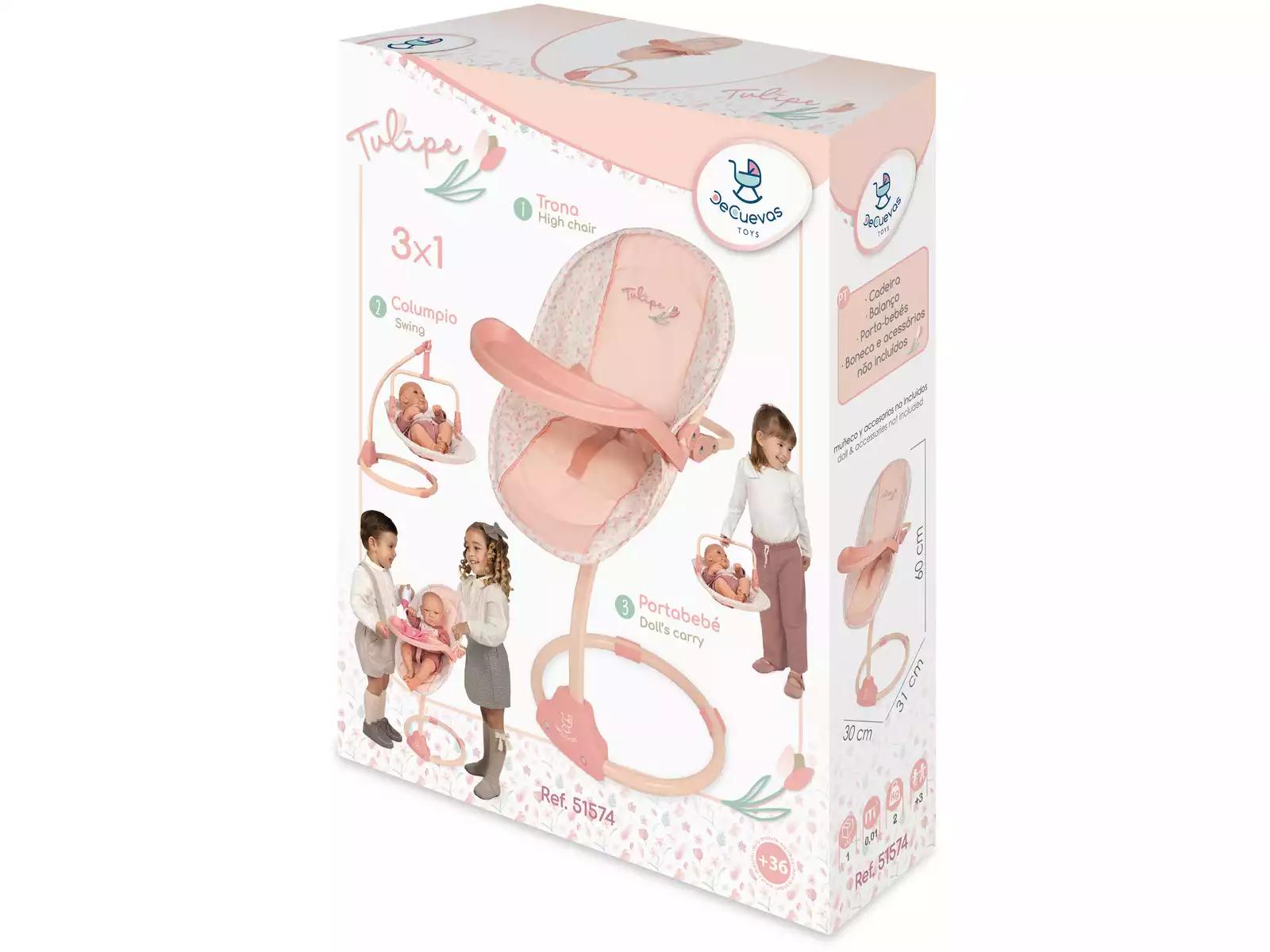 ¡Cuida y mima al bebé más especial de la casa! ¡Al llevarte a casa esta nueva y práctica Trona Columpio de Muñecas Tulipe 3×1 de DeCuevas!