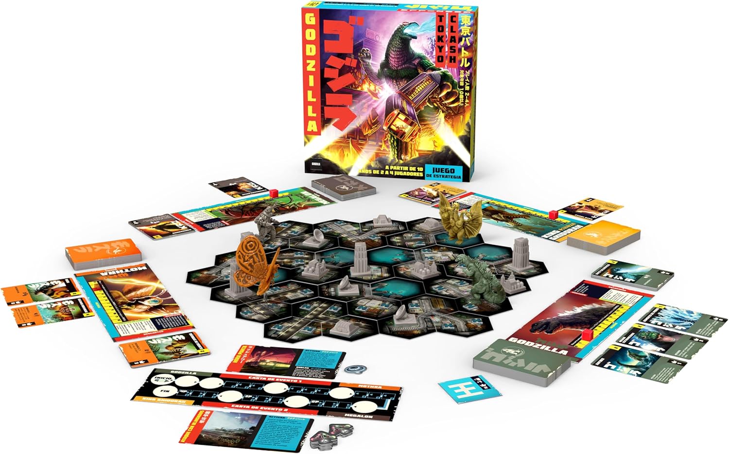 Mecánica del Juego: Domina las habilidades especiales de tu Kaiju y utiliza cartas estratégicas para lanzar ataques devastadores y controlar el campo de batalla. A medida que destruyes edificios y derrotas a tus oponentes, ganarás puntos que te acercarán a convertirte en el Rey de los Monstruos. Duración Aproximada del Juego: 45-60 minutos. Godzilla: Tokyo Clash es el juego perfecto para los fanáticos de los Kaiju y de las películas clásicas de monstruos. Ideal para noches de juegos en familia o con amigos, ¡este juego te transportará al caos y la destrucción de Tokio mientras luchas por el dominio absoluto!