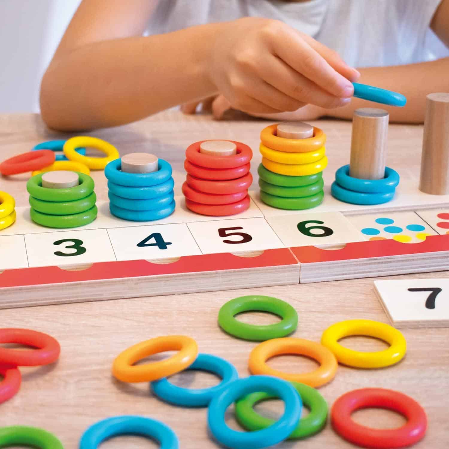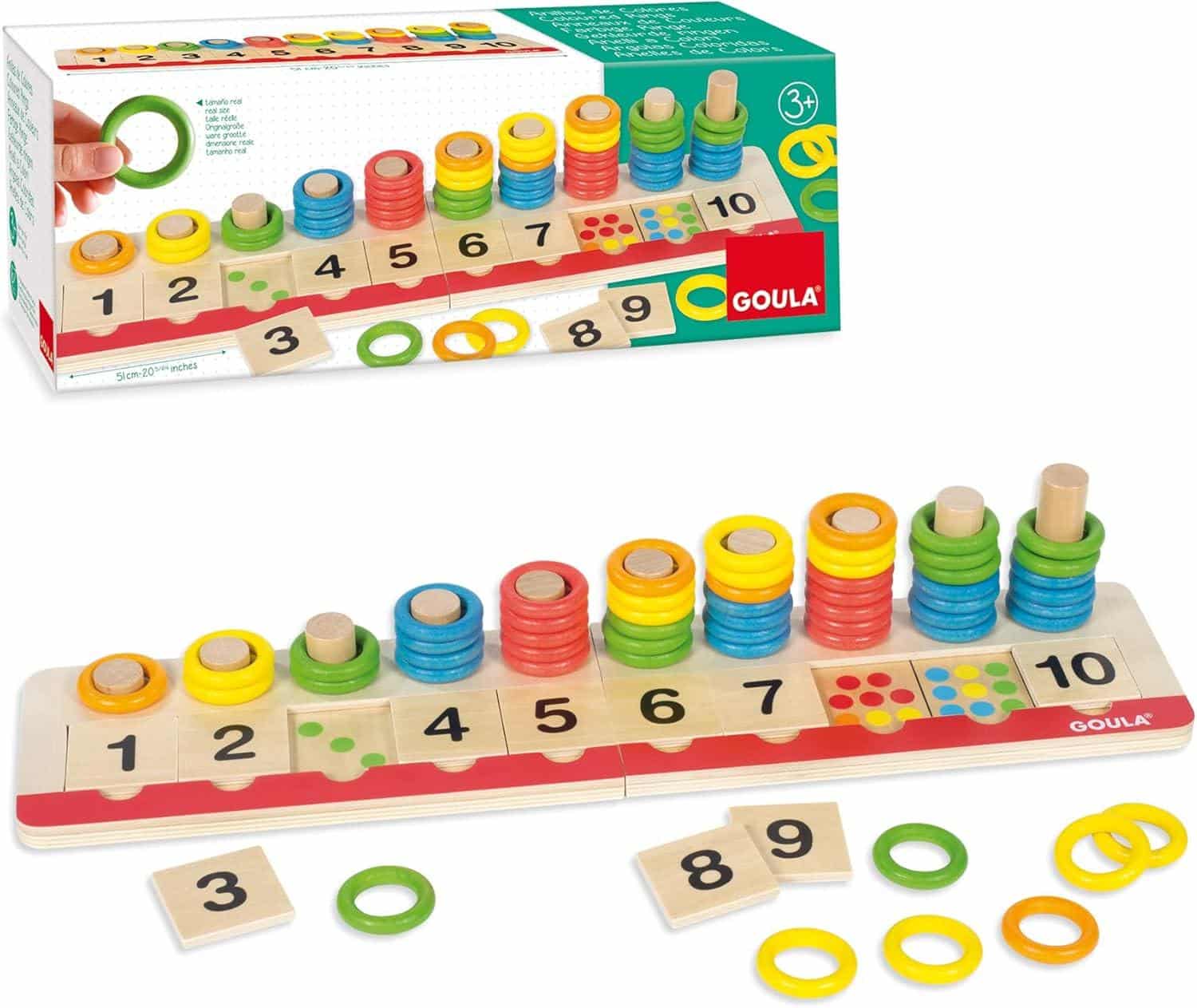 Contenido: 55 anillas de 5 colores distintos, 10 piezas de madera con el número 1-10, tablero de juego de madera y guía educativa