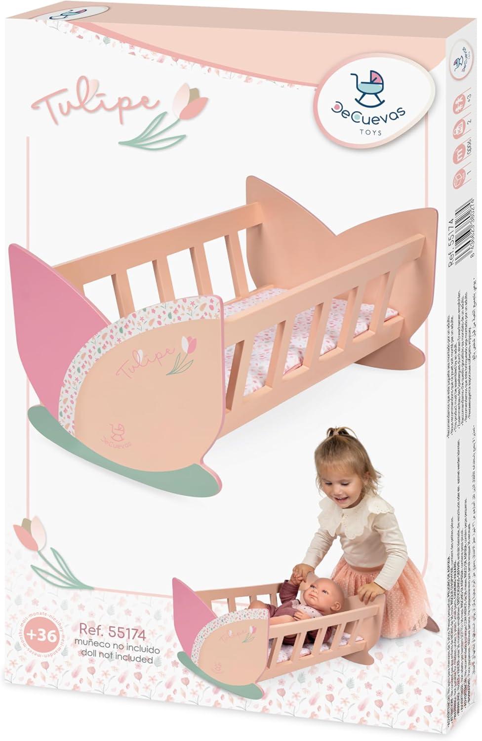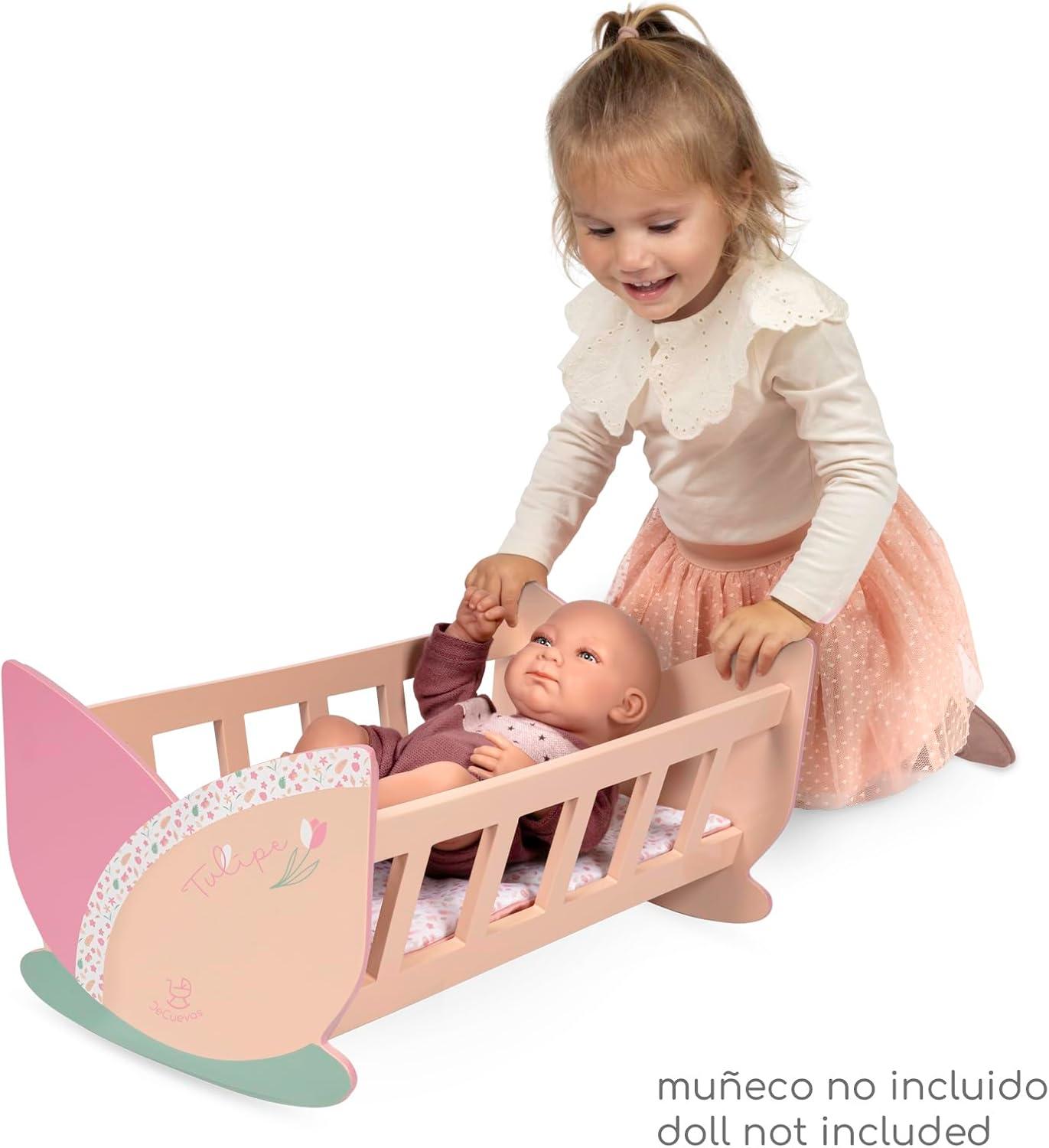 Incluye: 1 cuna de madera para muñecas serigrafiada con diseño especial de la linea Tulipe de color rosa, colchón con diseño especial de la colección y muchos más detalles de lujo.