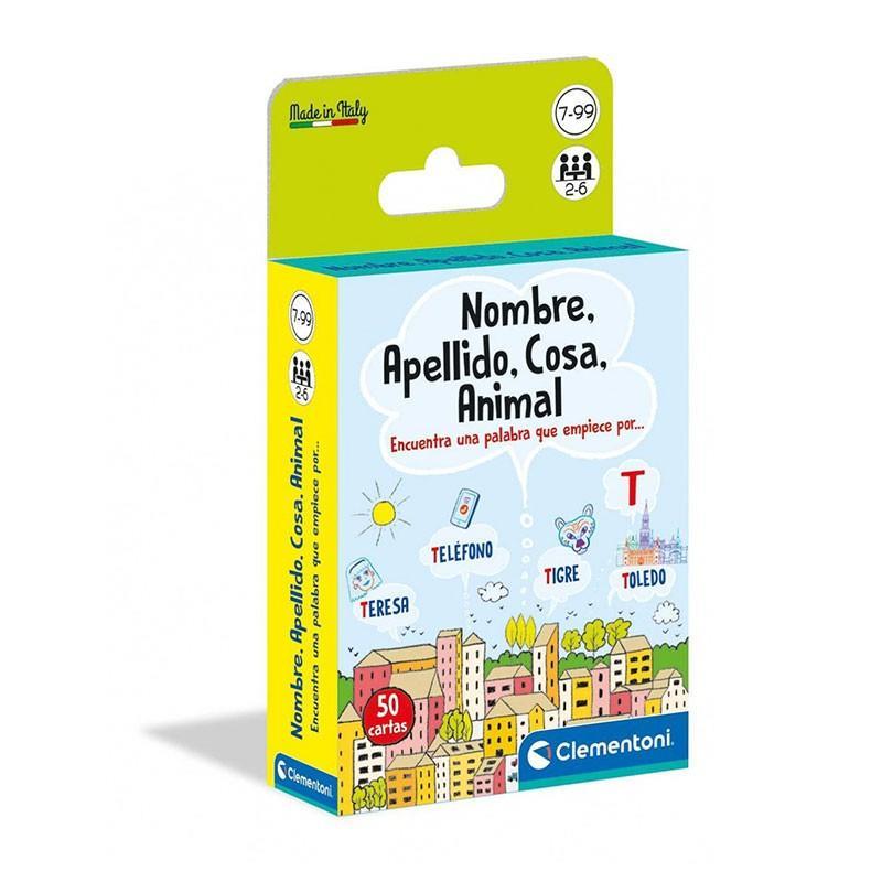 El Juego de mesa Nombre, Apellido, Cosa, Animal de Clementoni es una baraja de cartas que por un lado muestran una categoría divertida como (Nombres, Cosas y Ciudades) y por el otro una letra del alfabeto