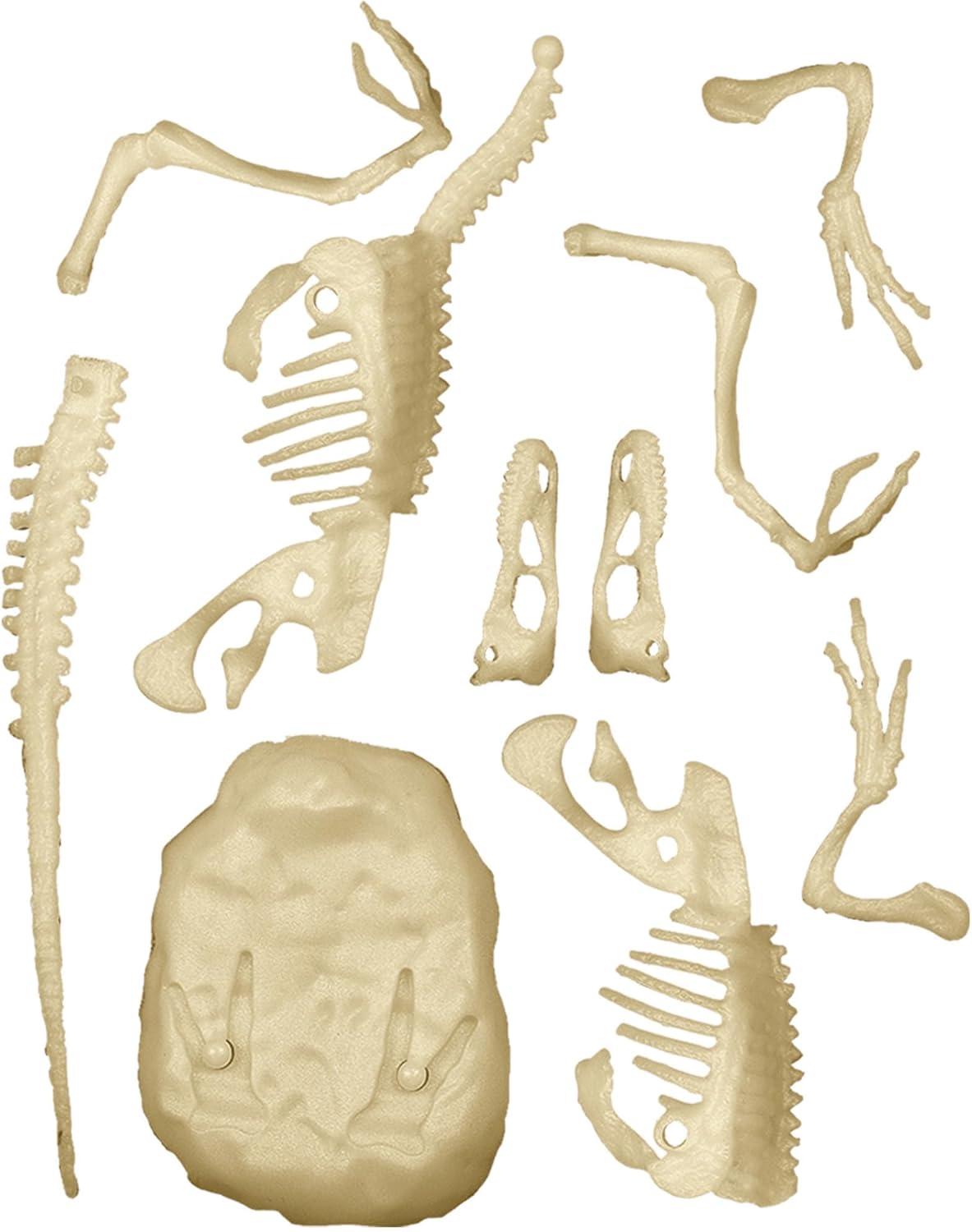 Diviértete encontrando y montando todos sus huesos y observando en la oscuridad el esqueleto luminoso de este dinosaurio óptimo; brillan en la oscuridad