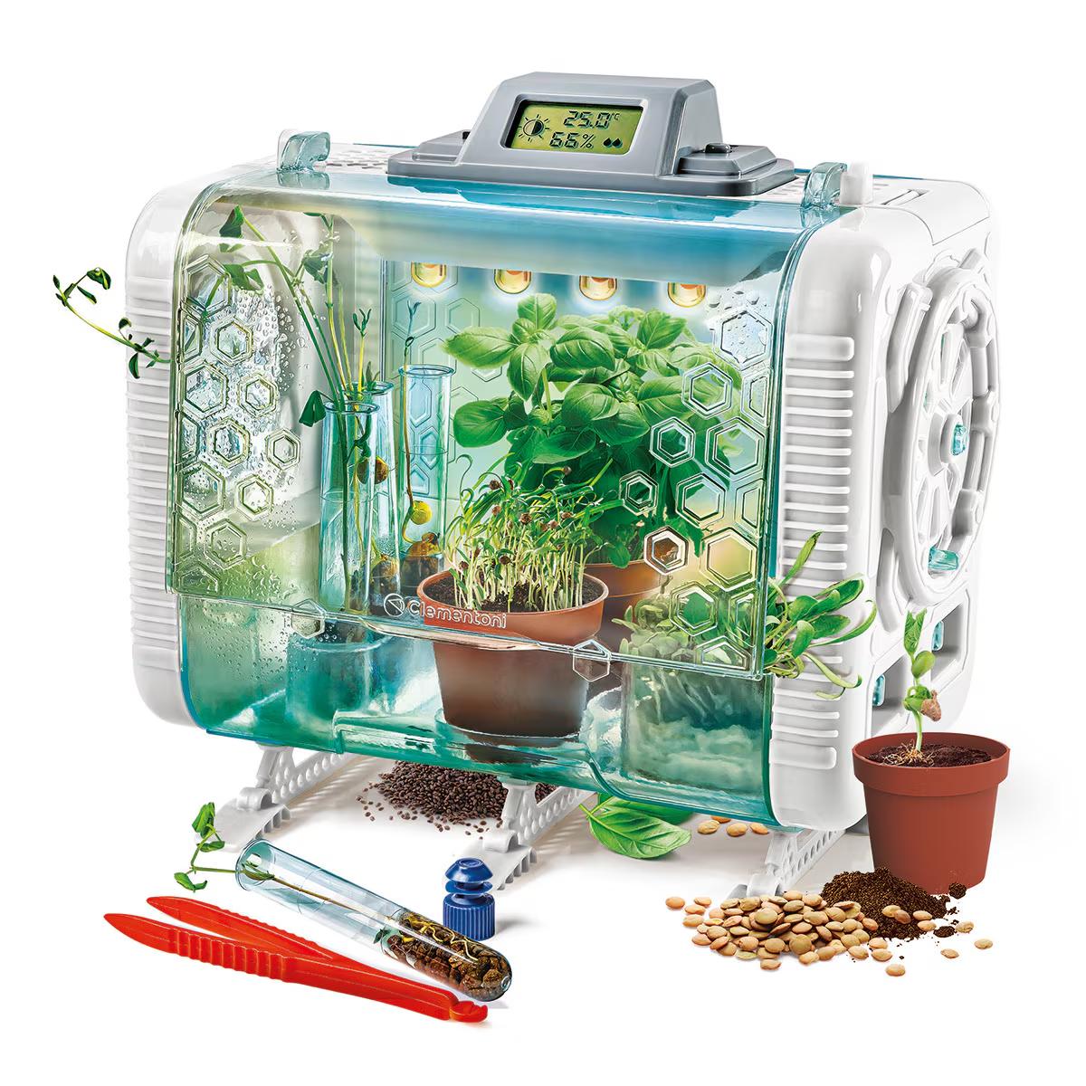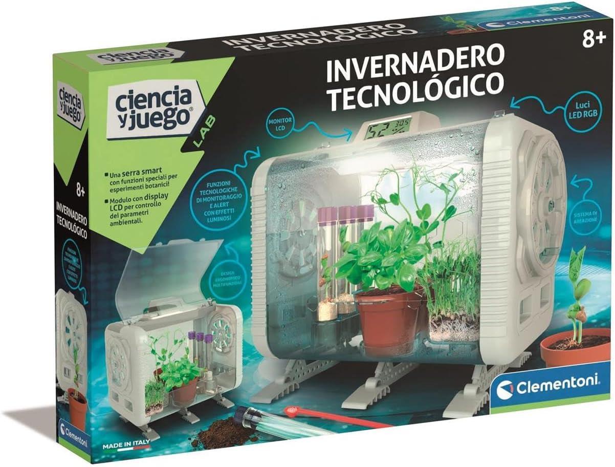 Clementoni – Invernadero Tecnológico – Juego de Botánica para Niños – Experimenta con la jardineria y la Ciencia – Es más que un simple invernadero… ¡es una experiencia de juego para experimentar con la botánica del futuro! ¡Presenta un diseño especial para entrenar tus «dedos verdes»! ¡Gracias a los sensores contenidos en el módulo y en la pantalla LCD, podrás comprobar la temperatura, la humedad y la iluminación dentro de tu invernadero en cualquier momento! ¡Presta atención a los efectos de luz! ¡Los LED indicarán cuando se necesita agua o cuando la temperatura es demasiado alta! ¡Enciéndelos por la noche si quieres, para que puedas observar tus plantas mientras crecen! Puedes experimentar con 3 formas diferentes en que crecen las plantas y aprender muchos datos interesantes sobre botánica. Edad recomendada: + 8 años