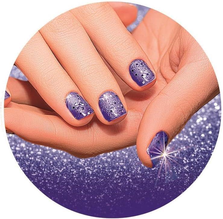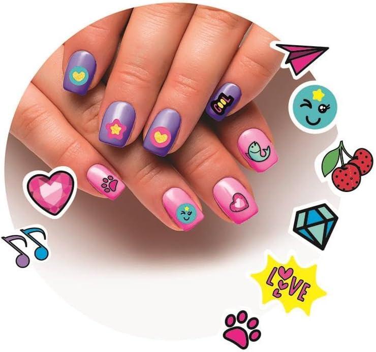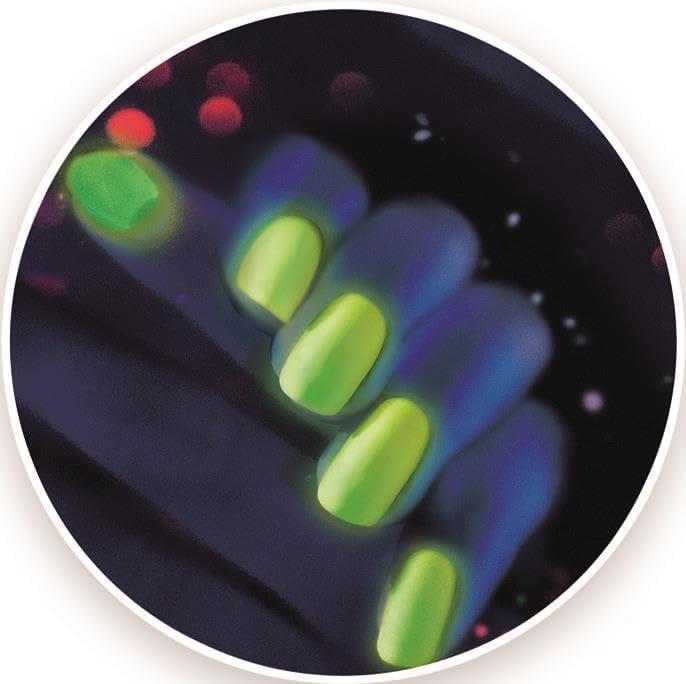 El juego incluye uñas postizas adhesivas y todo lo necesario para crear esmaltes de colores, con purpurina y que brillan en la oscuridad, mezclando la base con los colorantes incluidos en el kit