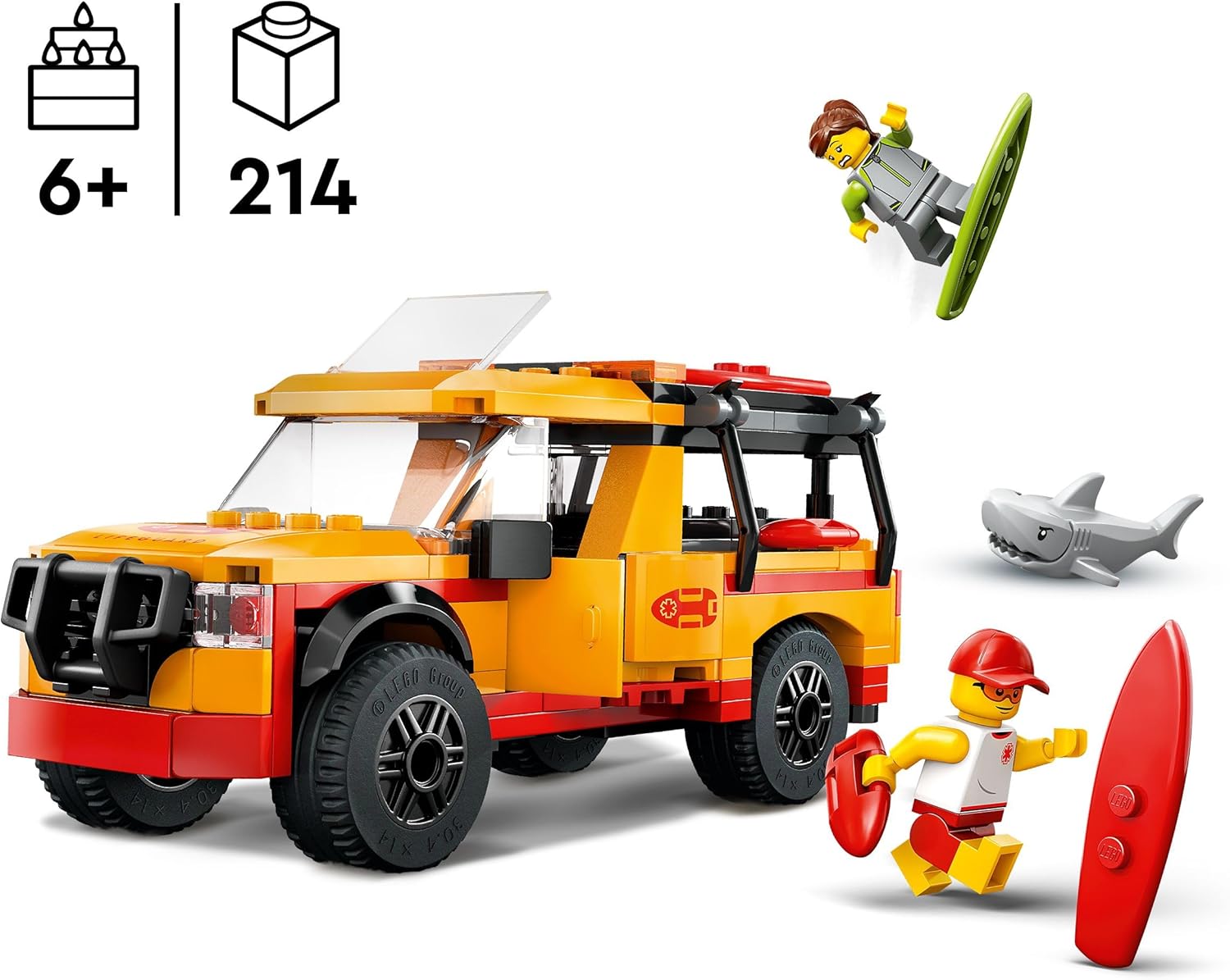 LEGO City Furgoneta de Rescate del Socorrista y Tiburón de Juguete, Juego de Playa con 2 Minifiguras y Accesorios como Tabla de Surf y Aletas, Regalo para Niños y Niñas de 6 Años o Más 60453