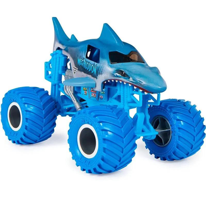 Diseño Inspirado en el Megalodón: Este camión monstruo presenta un diseño agresivo y detallado, con la silueta característica del Megalodón y colores vibrantes que evocan las profundidades del océano.